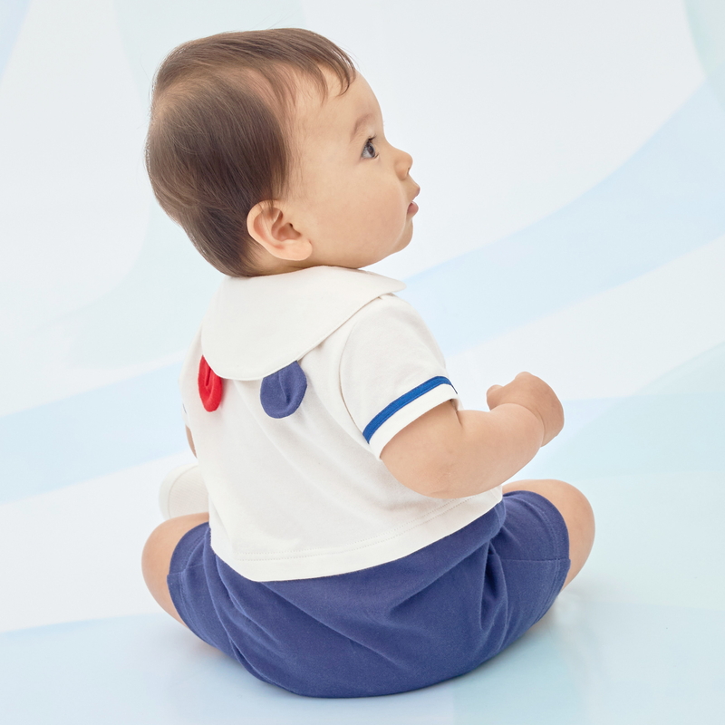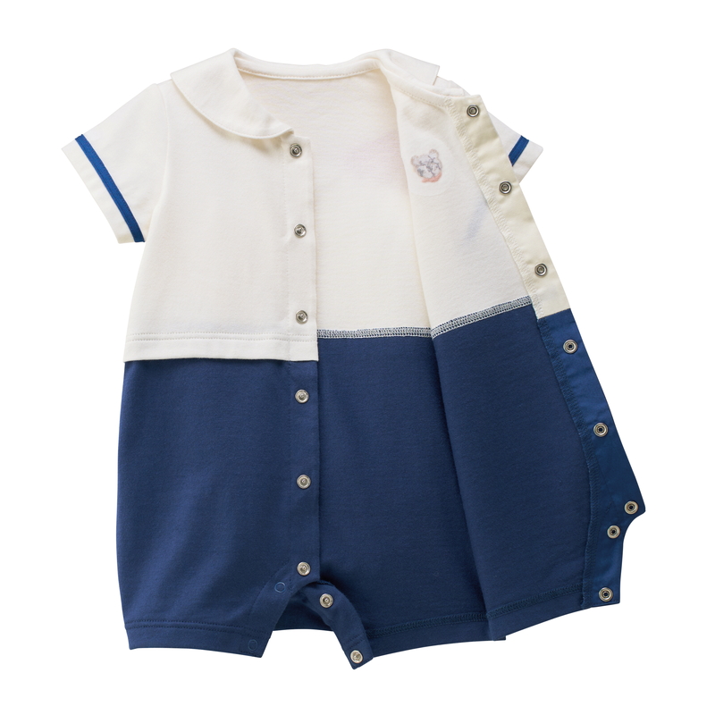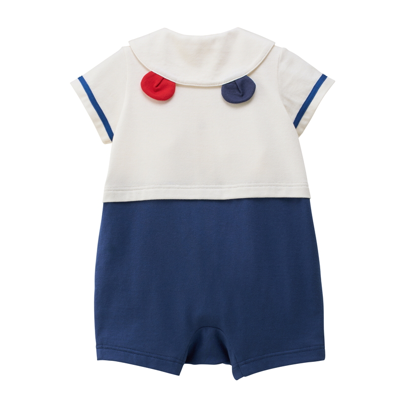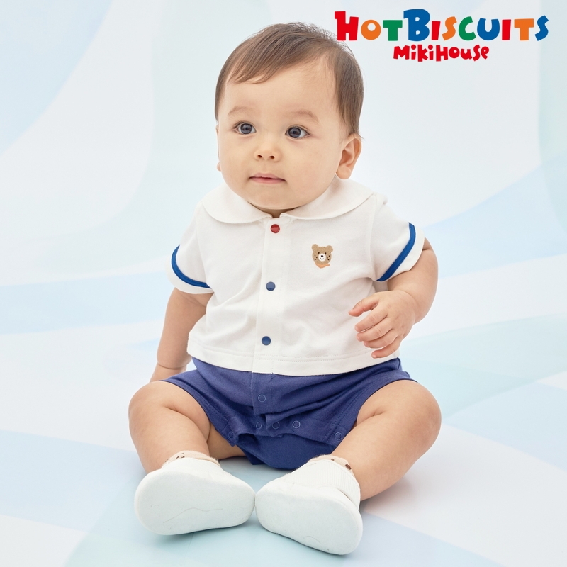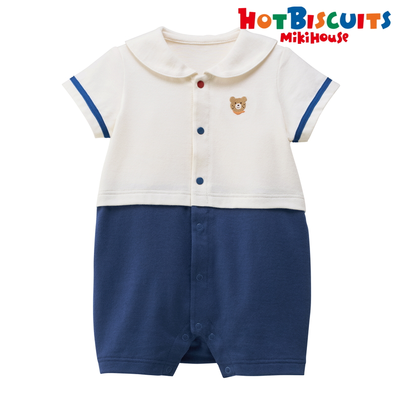 ミキハウス ホットビスケッツのセーラーカラーショートオール。 マリンテイストが夏らしいセパレート風デザインのショートオールです。 シンプルな中にも、胸元のビーンズの刺繍や袖のライン、カラフルなボタンなどこだわりが詰まっています。 襟の後ろ部分にはくま耳がついてよりかわいい後ろ姿に。 ユニセックスで着ていただけるデザインです。 [素材感] さらっとした肌触りで通気性がよく、汗をしっかりと吸収し 洗濯しても風合いが変わらず型くずれしにくい丈夫な天竺素材。 ……………………………………… 伸縮性:あり 生地:綿100% 袖丈:半袖 裾丈:5分丈 おすすめ着用シーズン:夏 ……………………………………… [スタイリング] 同じマリンテイストのTシャツ(72-5203-146)やワンピース(72-1902-793)とのリンクコーデも楽しめます。 ショートオールの上にポンチョやレッグウォーマーを合わせた、おでかけコーデもおすすめです◎ ●前ホックで股下まで全開でき、お着替えやオムツ替えにも便利 ●お尻はゆったりマチ付きで、活発なお子さまの動きを妨げません 《HOT BISCUITS ーホットビスケッツー》 ミキハウスホットビスケッツは、”Good Quality”がキーワードのブランド。 子どもたちには毎日ごきげんに、楽しく健やかに 過ごしてほしいから、 お子さまのための良いものづくりを大切にしています。 男の子も女の子も子どもらしく、おしゃれに可愛く着られるアイテムがいっぱい。 赤ちゃんからキッズまでの子ども服・ベビー服・ベビー用品等を幅広くご用意しています。 春夏秋冬の季節に合わせた、ご出産祝いやプレゼント、ギフトもおすすめです。