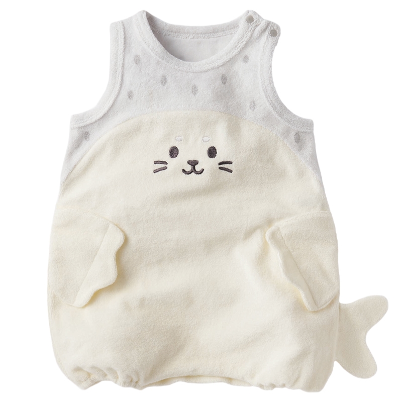 ●素材=スイカ・バナナ・アザラシ・ペンギン:綿76%ポリエステル24% カニ:上衣 綿100% 下衣・縁どり 綿76%ポリエステル24% ●サイズ(約・cm)= 60(身丈42.5・身幅26.8・足口上がり8.5) 70(身丈44.5・身幅27.8・足口上がり9) 80(身丈46.5・身幅28.8・足口上がり9.5)