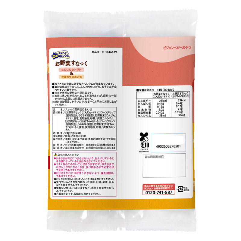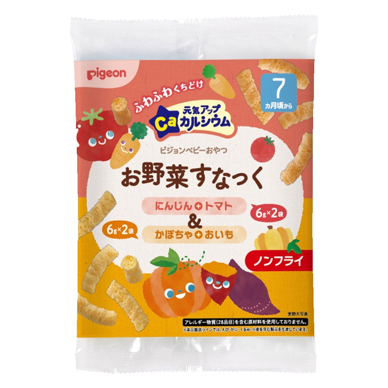 ●対象月齢:7ヵ月頃から ●内容量:お野菜すなっくにんじん+トマト6g×2袋、かぼちゃ+おいも6g×2袋 ●原材料名: 【お野菜すなっく(にんじん+トマト)】コーングリッツ(国内製造)、うるち米(国産)、野菜粉末(にんじん、トマト)、食塩、食用油脂、砂糖/炭酸カルシウム 【お野菜すなっく(かぼちゃ+おいも)】コーングリッツ(国内製造)、うるち米(国産)、野菜粉末(かぼちゃ、さつまいも)、食塩、食用油脂、砂糖/炭酸カルシウム アレルギー物質(28品目)を含む原材料を使用しておりません。 ※本品製造ラインでは、えび・かに・くるみ・小麦を含む製品を生産しています。