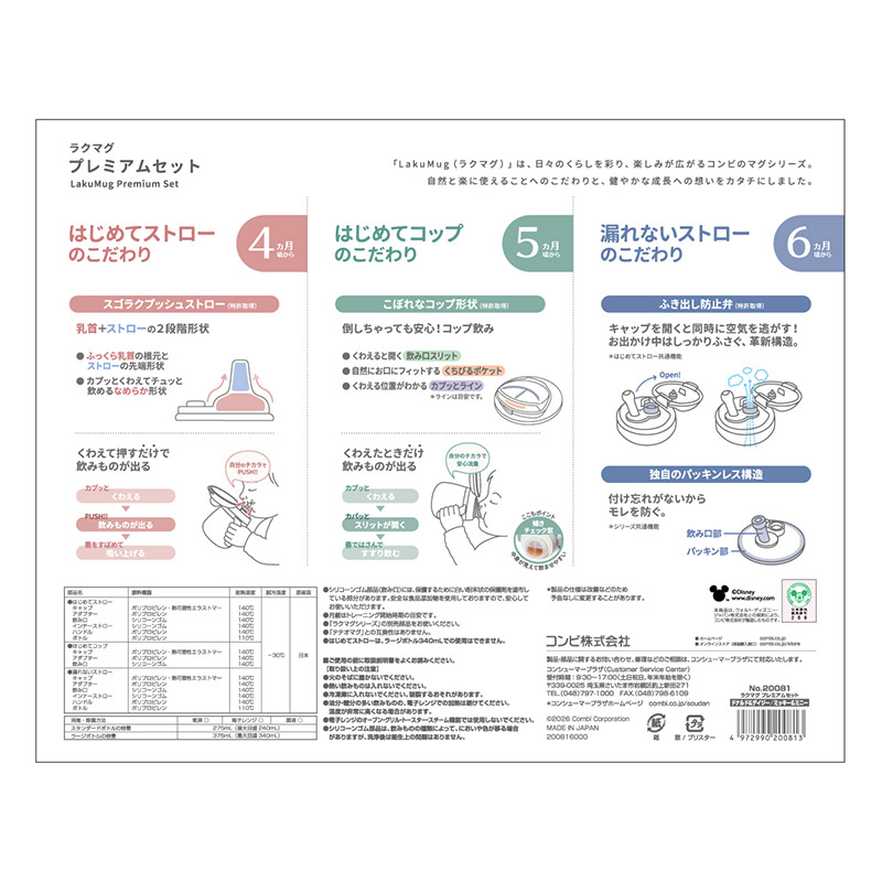 選べるボトルと飲み口。4ヵ月頃からずっと使えるパーフェクトセット。 「大人もキュンとするかわいらしさ」をテーマにした、新デザインが仲間入り。 ディズニーの魅力を活かしながら、大人かわいいテイストにリニューアルしました。 Lakumagu(ラクマグ)は日々のくらしを彩り、楽しみが広がるコンビの日本製マグシリーズ。 自然と楽に使えることへのこだわりと、健やかな成長への想いをカタチにしました。 (c)Disney