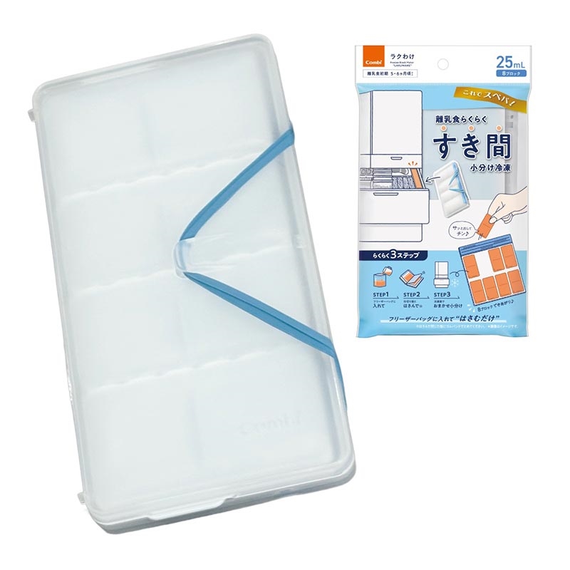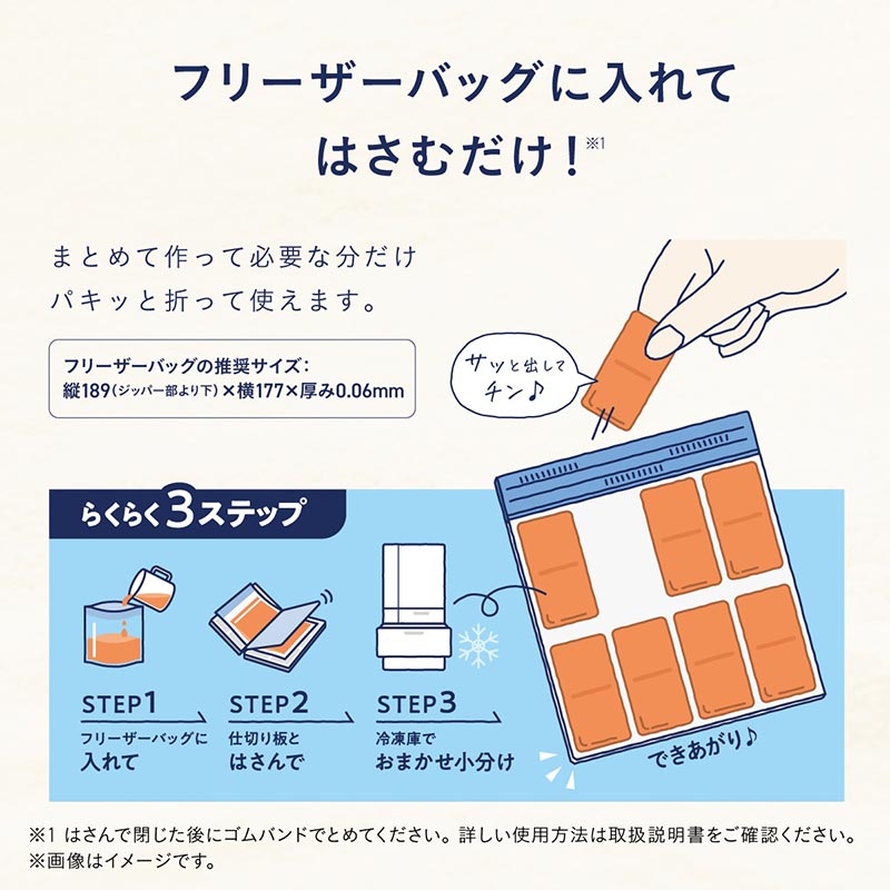 ●混み合った冷凍庫でも、“すき間”にスッキリ。 奥行きの浅い冷凍室や、食品で一杯になった引き出しでも、「ラクわけ」なら、スリムな形状で、置き方を選ばないので“すき間”にサッと入れて離乳食を凍らせることができます。 ●離乳食をフリーザーバッグ※に入れてはさむと、カンタンに小分けができる便利アイテム。 スプーンで分けたり、こぼれたりするストレスがなく、キッチンが汚れにくいのもポイント。 ※フリーザーバッグは別売です。 ※フリーザーバッグの推奨サイズ:縦189(ジッパー部より下)×横177×厚み0.06mm ●食材が製品に直接触れないから、より衛生的。 使用後の洗い物も最低限で済み、毎日の準備と片付けがよりスマートになります。 ●各ブロックの中央にへこみがあるから、凍った1ブロックを簡単に半分にでき、更に小分けが可能。 少量だけ使いたい離乳食初期に便利です。 ●食洗機・電子レンジ除菌OK。 汚れが気になった時は食洗機で洗えるからお手入れもラクラク。 ※ゴムバンドおよび業務用食洗機を除く。