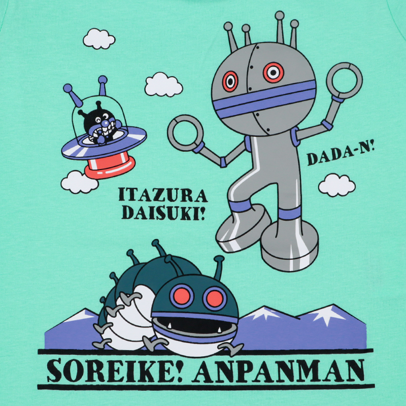 ●素材=綿100% ●サイズ(約・cm)= [80]着丈33 身幅30 肩幅23 袖丈9.5 [90]着丈36 身幅31 肩幅24 袖丈10 [95]着丈38 身幅32 肩幅25 袖丈10.5 [100]着丈39 身幅33 肩幅26 袖丈11 ●洗濯表示=洗濯可 ●原産国=バングラデシュ製 (c)やなせたかし/フレーベル館・TMS・NTV