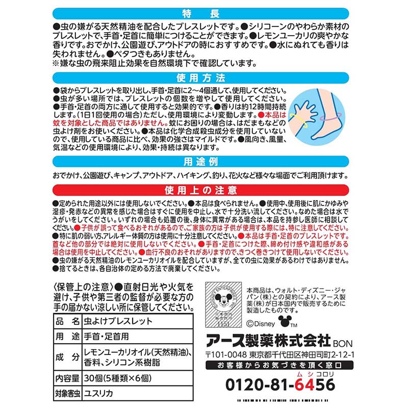 親子で使えるシリコーン製のやわらか虫よけ ●虫の嫌がる天然精油を配合した虫よけです。 ●5種類のかわいいデザインの虫よけです。 ●シリコーンのやわらか素材ので、手首・足首に簡単につけることができます。 ●香りは約12時間持続します。(1日1回使用) ●レモンユーカリの爽やかな香りです。おでかけ、公園遊び、アウトドアの時におすすめです。 ●水にぬれても香りは失われません。 (c)Disney