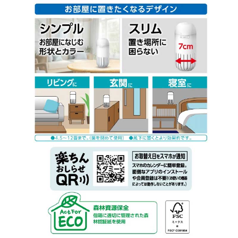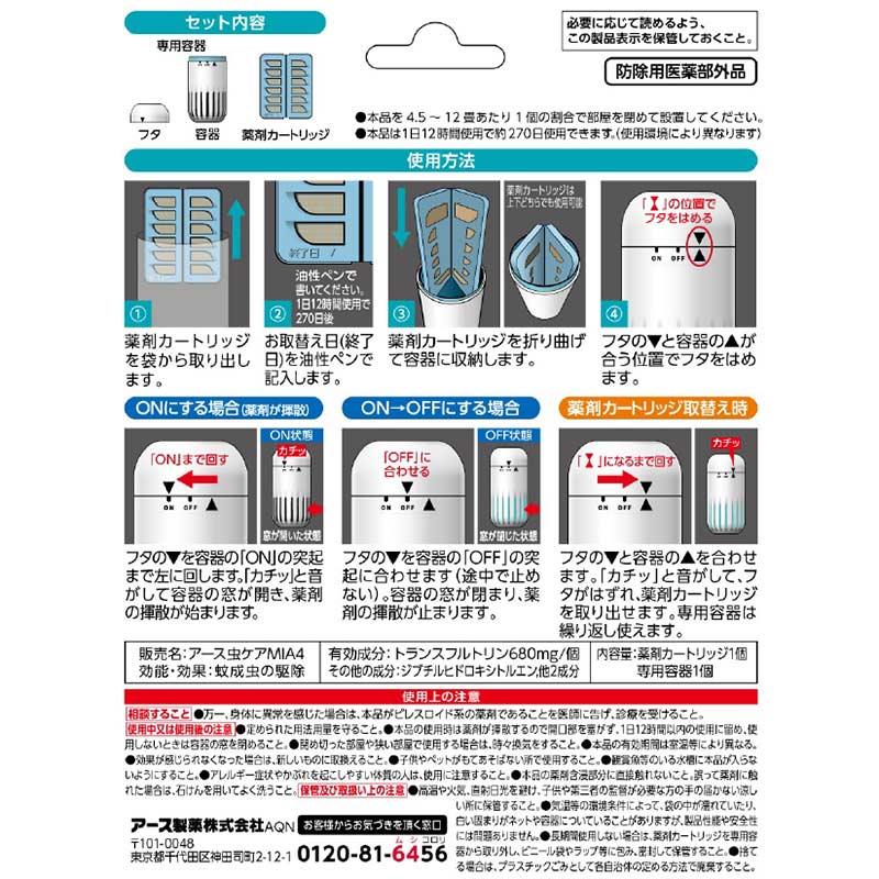 ●対象月齢:0ヵ月~ ●内容量:専用容器1個、薬剤カートリッジ1個 ●効能効果:蚊成虫の駆除 ●有効成分:トランスフルトリン、ジブチルヒドロキシトルエン ●効果持続期間:1日12時間使用で約270日使用できます。