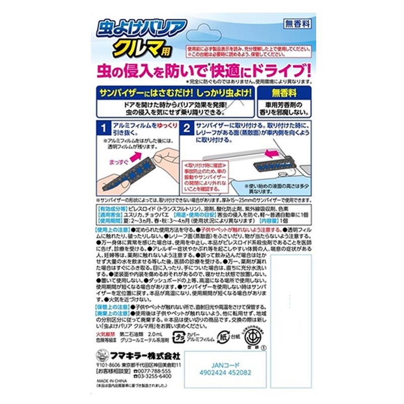 ●対象月齢:0ヵ月~ ●サイズ(㎜):幅119×奥行42×高さ190 ●重さ:43g ●有効成分等 :ピレスロイド(トランスフルトリン)、溶剤、酸化防止剤、紫外線吸収剤、色素 ●適用害虫 :ユスリカ、チョウバエ ●用途・使用の目安:害虫の侵入を防ぐ。軽~普通自動車に1個 ●使用期間 :夏 2~3ヵ月、春・秋 3~4ヵ月(使用状況により異なります) ●内容量 :1個