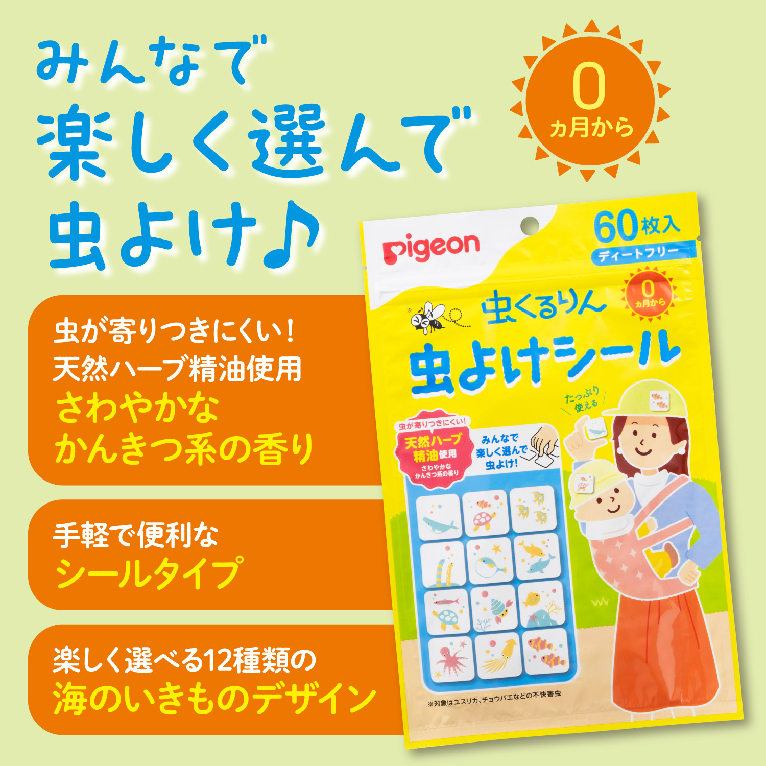 ●対象月齢:0ヵ月~ ●対象害虫:ユスリカ、チョウバエなどの不快害虫 ●内容量:60枚 【使用方法】 ・シールを一枚ずつはがし、袖口、襟、ズボンのすそ、帽子、ベビーカーなどに貼ってください。 ・使用目安:1回につき6カ所程度 ・持続時間:約6~8時間(使用環境により異なります) 【注意事項】 ・直接肌に貼らないでください。 ・本品は食べられません。 ・使用後は洋服やベビーカーなどからはがしてください。 貼り付けたまま洗濯すると粘着剤が付着する場合があります。 ・革や合成皮革などは風合いを損ねる場合がありますので使用を避けてください。