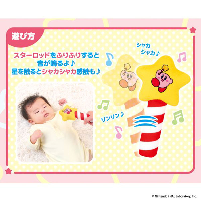 カービィの世界観にぴったり!スターロッドをイメージした布製のラトルです。 星の部分には鈴が入っていて、振るとリンリン音が鳴り、握るとパリパリ感触が楽しめます。