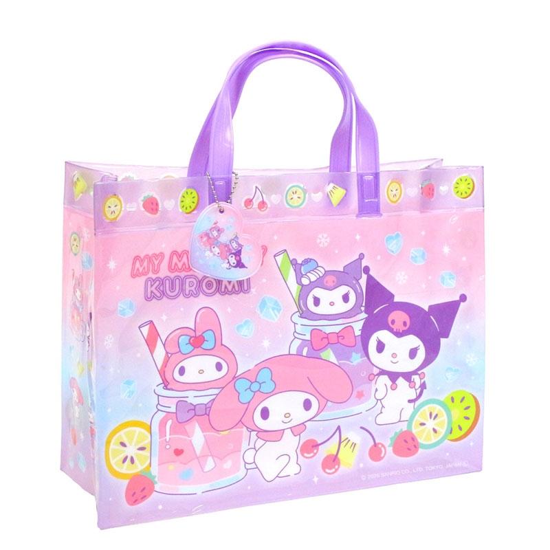 海水浴やスイミングスクールに人気のビニール素材を使用。 形状がマチアリなので、水着やタオルなど十分に収納可能。 マイメロディとクロミが全面にプリントされたビーチバッグです。 他のバッグにも付けられるネームホルダー付き。
