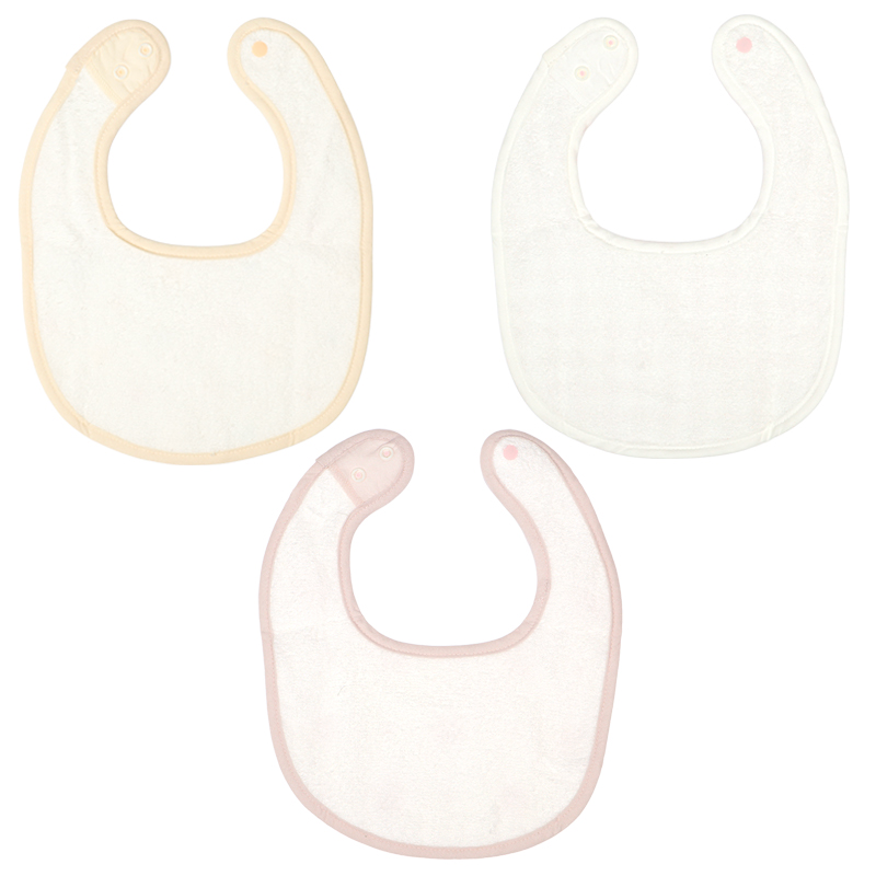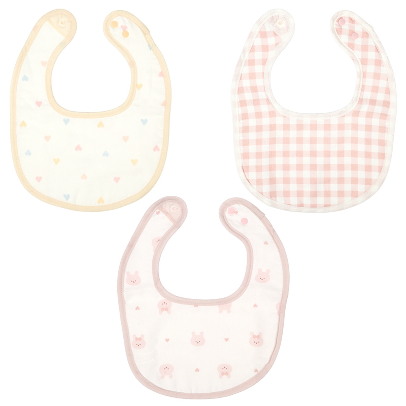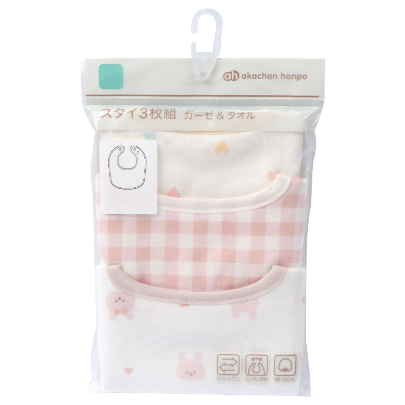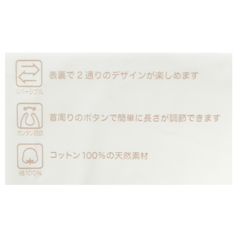 リバーシブルタイプ。 首まわりのボタンで長さの調節も簡単。 吸水性や通気性のよい、ガーゼとタオル素材。 洗い替えにうれしい3枚組。