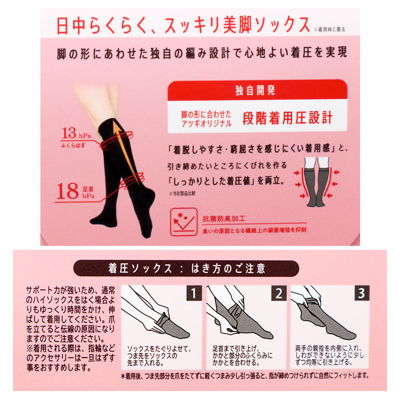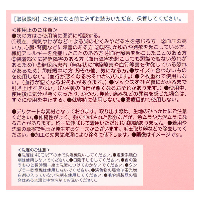 商品サイズ:23~25cm 素材:ナイロン・ポリウレタン 特徴:足首18hPa、ふくらはぎ13hPa、DCY交編、ヌードトウ、コンベンショナルヒール、抗菌防臭加工、足型セット加工 原産国:中国