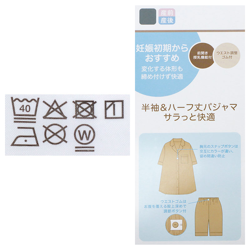 ●素材=トップス・パンツ ポリエステル49% 再生繊維(セルロース)28% 綿23% ●洗濯表示=液温は40℃を限度とし洗濯機で非常に弱い洗濯処理ができる。漂白処理はできない。 タンブル乾燥はできない。日陰でのつり干し乾燥がよい。底面温度120℃を限度としてアイロン仕上げができる。 ドライクリーニング処理ができない。非常に弱い処理でのウェットクリーニング処理ができる。 ●サイズスペック=トップス MーLサイズ 丈67 身幅54.2 肩線41.5 袖丈20 パンツ M-Lサイズ 股下22 裾巾32 脇総丈55.3 渡り寸35.4 ●対象期間=産前~産後