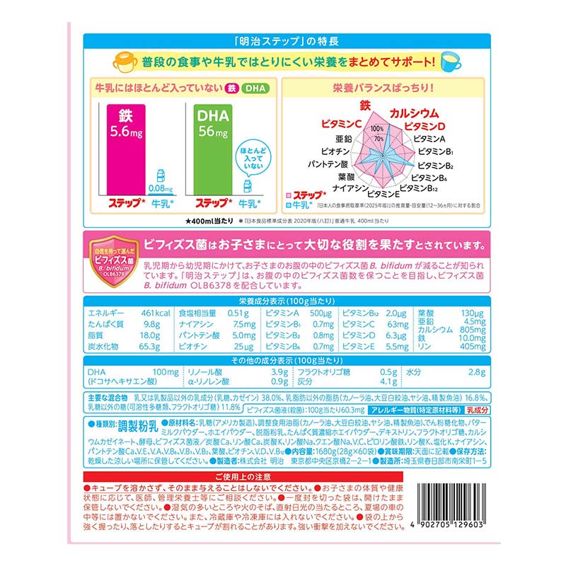 ●種類別:調製粉乳 ●対象月齢:1-3歳頃まで ●内容量:1680g ●原材料:乳糖(アメリカ製造)、調整食用油脂(カノーラ油、大豆白絞油、ヤシ油、精製魚油)、でん粉糖化物、バターミルクパウダー、ホエイパウダー、脱脂粉乳、たんぱく質濃縮ホエイパウダー、デキストリン、フラクトオリゴ糖、カルシウムカゼイネート、酵母、ビフィズス菌液/炭酸Ca、リン酸Ca、炭酸K、リン酸Na、クエン酸Na、V.C、ピロリン酸鉄、リン酸K、塩化K、ナイアシン、パントテン酸Ca、V.E、V.A、V.B6、V.B1、V.B2、葉酸、ビオチン、V.D、V.B12 ●栄養成分 100g当たり 熱量 461kcal たんぱく質 9.8g 脂質 18.0g 炭水化物 65.3g ナトリウム -mg 食塩相当量 0.51g ナイアシン 7.5㎎ パントテン酸 5.0㎎ ビオチン 25μg ビタミンA 500μg ビタミンB1 0.7mg ビタミンB2 0.8mg ビタミンB6 0.7mg ビタミンB12 2.0 μg ビタミンC 63mg ビタミンD 6.3μg ビタミンE 5.5mg 葉酸 130μg カルシウム 805㎎ 鉄 10.0㎎ リン 405㎎ DHA 100ドコサヘキサエン酸 リノール酸 3.9g α-リノレン酸 0.9g フラクトオリゴ糖 0.5g 灰分 4.1g 水分 2.8g ビフィズス菌 60.3殺菌