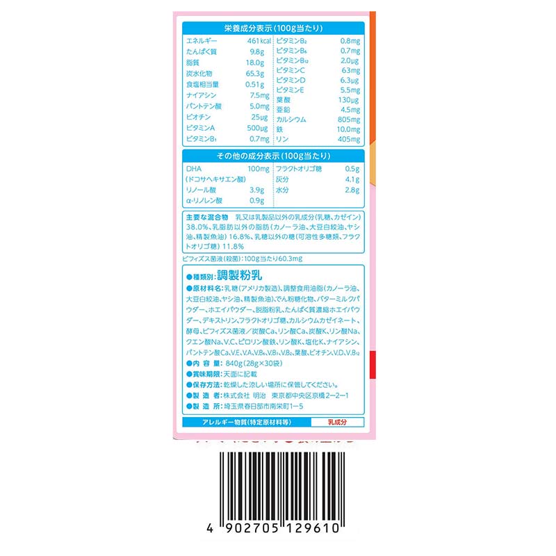 ●種類別:調製粉乳 ●対象月齢:1-3歳頃まで ●内容量:840g ●原材料:乳糖(アメリカ製造)、調整食用油脂(カノーラ油、大豆白絞油、ヤシ油、精製魚油)、でん粉糖化物、バターミルクパウダー、ホエイパウダー、脱脂粉乳、たんぱく質濃縮ホエイパウダー、デキストリン、フラクトオリゴ糖、カルシウムカゼイネート、酵母、ビフィズス菌液/炭酸Ca、リン酸Ca、炭酸K、リン酸Na、クエン酸Na、V.C、ピロリン酸鉄、リン酸K、塩化K、ナイアシン、パントテン酸Ca、V.E、V.A、V.B6、V.B1、V.B2、葉酸、ビオチン、V.D、V.B12 ●栄養成分 100g当たり 熱量 461kcal たんぱく質 9.8g 脂質 18.0g 炭水化物 65.3g ナトリウム -mg 食塩相当量 0.51g ナイアシン 7.5㎎ パントテン酸 5.0㎎ ビオチン 25μg ビタミンA 500μg ビタミンB1 0.7mg ビタミンB2 0.8mg ビタミンB6 0.7mg ビタミンB12 2.0 μg ビタミンC 63mg ビタミンD 6.3μg ビタミンE 5.5mg 葉酸 130μg カルシウム 805㎎ 鉄 10.0㎎ リン 405㎎ DHA 100ドコサヘキサエン酸 リノール酸 3.9g α-リノレン酸 0.9g フラクトオリゴ糖 0.5g 灰分 4.1g 水分 2.8g ビフィズス菌 60.3殺菌