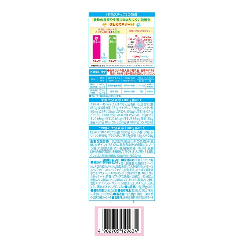 ●種類別:調製粉乳 ●対象月齢:1-3歳頃まで ●内容量:112g ●原材料:乳糖(アメリカ製造)、調整食用油脂(カノーラ油、大豆白絞油、ヤシ油、精製魚油)、でん粉糖化物、バターミルクパウダー、ホエイパウダー、脱脂粉乳、たんぱく質濃縮ホエイパウダー、デキストリン、フラクトオリゴ糖、カルシウムカゼイネート、酵母、ビフィズス菌液/炭酸Ca、リン酸Ca、炭酸K、リン酸Na、クエン酸Na、V.C、ピロリン酸鉄、リン酸K、塩化K、ナイアシン、パントテン酸Ca、V.E、V.A、V.B6、V.B1、V.B2、葉酸、ビオチン、V.D、V.B12 ●栄養成分 100g当たり 熱量 461kcal たんぱく質 9.8g 脂質 18.0g 炭水化物 65.3g ナトリウム -mg 食塩相当量 0.51g ナイアシン 7.5㎎ パントテン酸 5.0㎎ ビオチン 25μg ビタミンA 500μg ビタミンB1 0.7mg ビタミンB2 0.8mg ビタミンB6 0.7mg ビタミンB12 2.0 μg ビタミンC 63mg ビタミンD 6.3μg ビタミンE 5.5mg 葉酸 130μg カルシウム 805㎎ 鉄 10.0㎎ リン 405㎎ DHA 100ドコサヘキサエン酸 リノール酸 3.9g α-リノレン酸 0.9g フラクトオリゴ糖 0.5g 灰分 4.1g 水分 2.8g ビフィズス菌 60.3殺菌