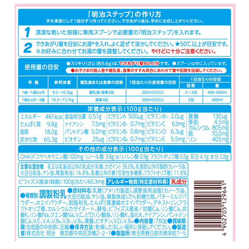 ●種類別:調製粉乳 ●対象月齢:1-3歳頃まで ●内容量:780g ●原材料 乳糖(アメリカ製造)、調整食用油脂(カノーラ油、大豆白絞油、ヤシ油、精製魚油)、でん粉糖化物、バターミルクパウダー、ホエイパウダー、脱脂粉乳、たんぱく質濃縮ホエイパウダー、デキストリン、フラクトオリゴ糖、カルシウムカゼイネート、酵母、ビフィズス菌液/炭酸Ca、リン酸Ca、炭酸K、リン酸Na、クエン酸Na、V.C、ピロリン酸鉄、リン酸K、塩化K、ナイアシン、パントテン酸Ca、V.E、V.A、V.B6、V.B1、V.B2、葉酸、ビオチン、V.D、V.B12 ●栄養成分 100g当たり 熱量 461kcal たんぱく質 9.8g 脂質 18.0g 炭水化物 65.3g ナトリウム -mg 食塩相当量 0.51g ナイアシン 7.5㎎ パントテン酸 5.0㎎ ビオチン 25μg ビタミンA 500μg ビタミンB1 0.7mg ビタミンB2 0.8mg ビタミンB6 0.7mg ビタミンB12 2.0 μg ビタミンC 63mg ビタミンD 6.3μg ビタミンE 5.5mg 葉酸 130μg カルシウム 805㎎ 鉄 10.0㎎ リン 405㎎ DHA 100ドコサヘキサエン酸 リノール酸 3.9g α-リノレン酸 0.9g フラクトオリゴ糖 0.5g 灰分 4.1g 水分 2.8g ビフィズス菌 60.3殺菌