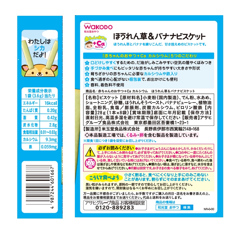 ●対象月齢:9ヵ月頃~ ●原材料:小麦粉(国内製造)、でん粉、水あめ、ショートニング、砂糖、ほうれんそうペースト、バナナピューレー、植物油脂、全粉乳、食塩/膨脹剤、炭酸カルシウム、ピロリン酸鉄【栄養成分表示】エネルギー:16kcal、たんぱく質:0.20g、脂質:0.42g、炭水化物:2.8g、食塩相当量:0.01~0.03g、カルシウム:9.3mg、鉄:0.059mg