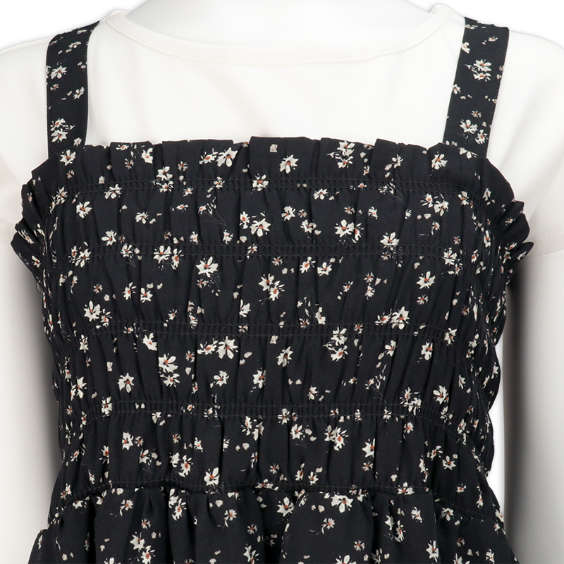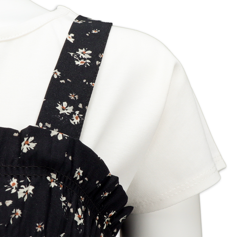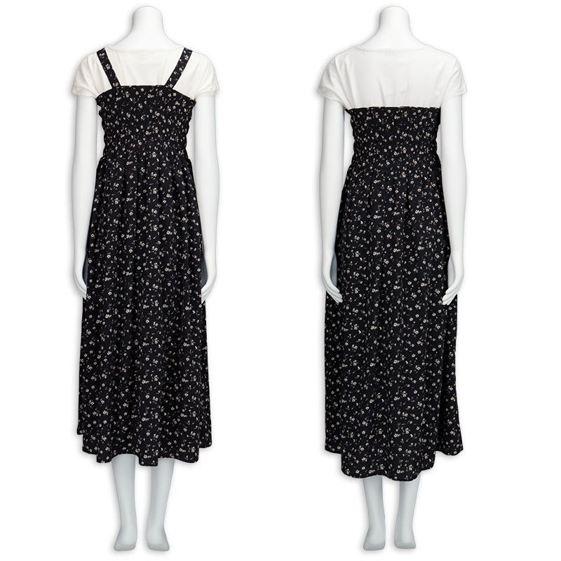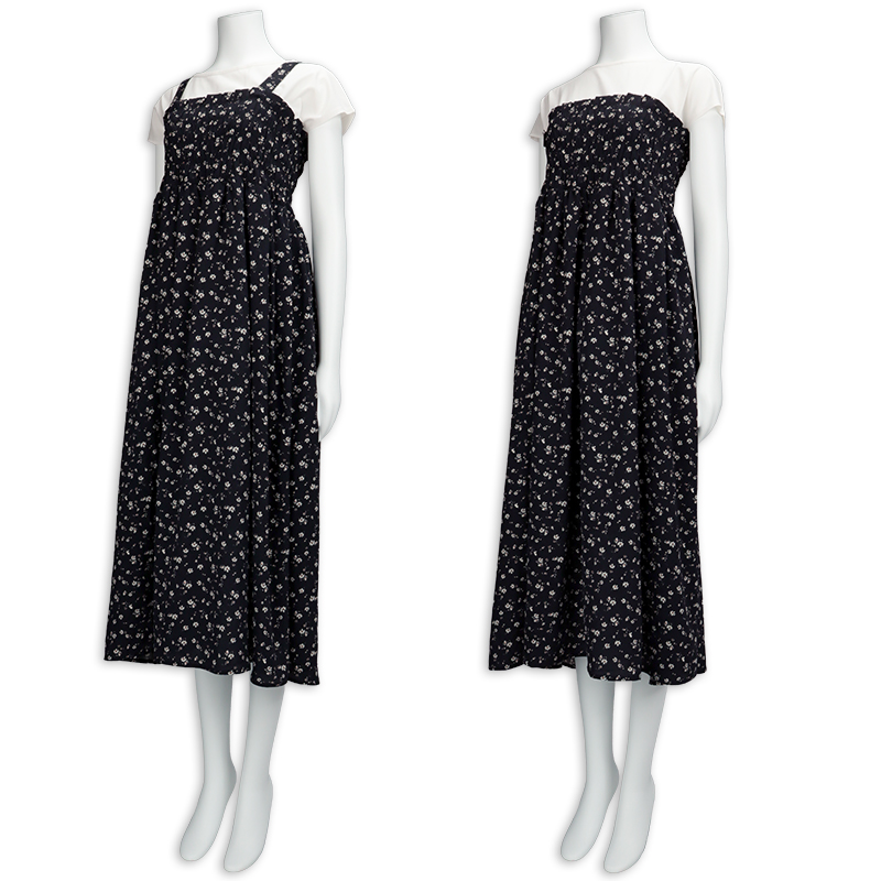 上身頃にシャーリング加工を施し、体に優しくフィットしながらも着心地の良いテンションで着脱しやすくしています。肩ひもを取りはずしできベアトップワンピース、スカートにもなる3WAYタイプ。肩ひもの釦ホールでひもの長さ調整もでき、単品力に優れています。接触冷感のあるインナージャージはフレンチ袖で1枚着でもインナーとしても使える重宝アイテムです。お出掛け、旅行にお勧めなセットアップです。