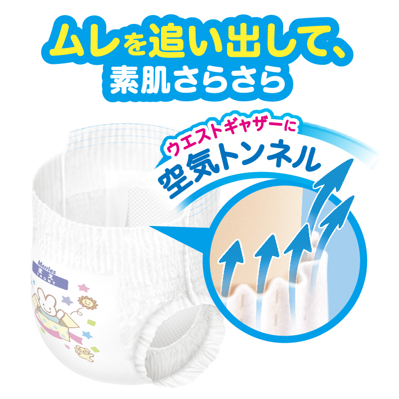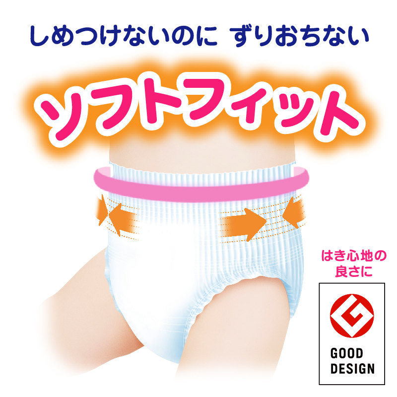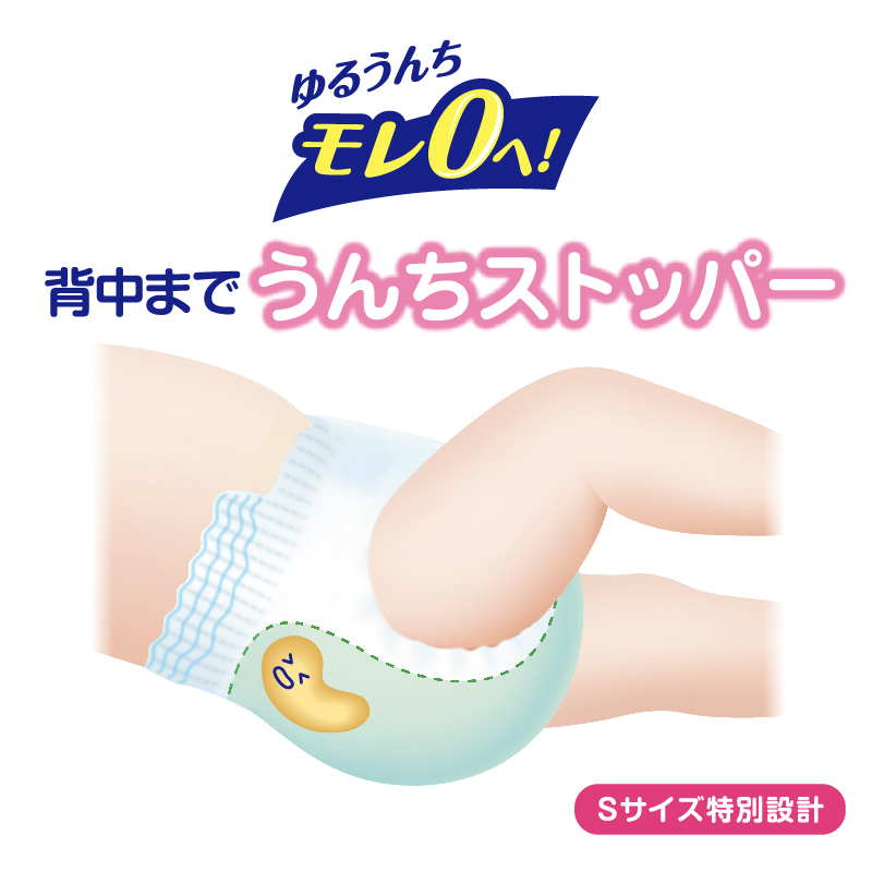 全面パワフル通気シートでおしっこ後もずっと肌さら!ふんわりエアインクッションで肌に触れる面もやわらか。 独自の凹凸シートでゆるうんちを広げず、さらに背中すっぽりカバーと足まわりの立体うんちストッパーですきまからのモレも防いでゆるうんちモレ0へ。 ウエストが2.5倍*ものびるからはかせやすく、ふんわりフィット。 *伸ばす前に対して(花王調べ)