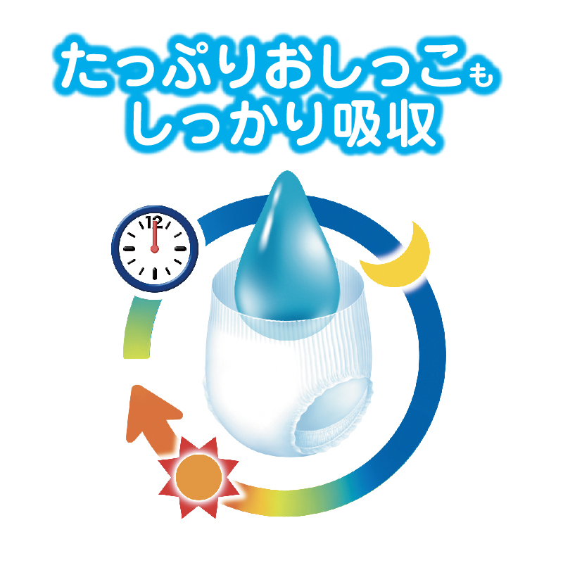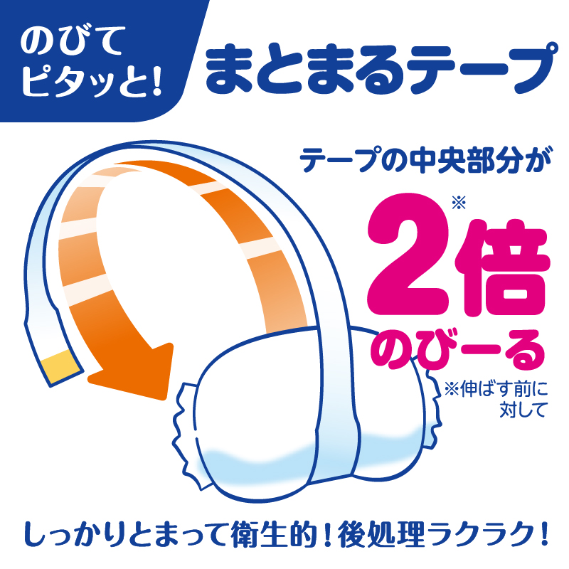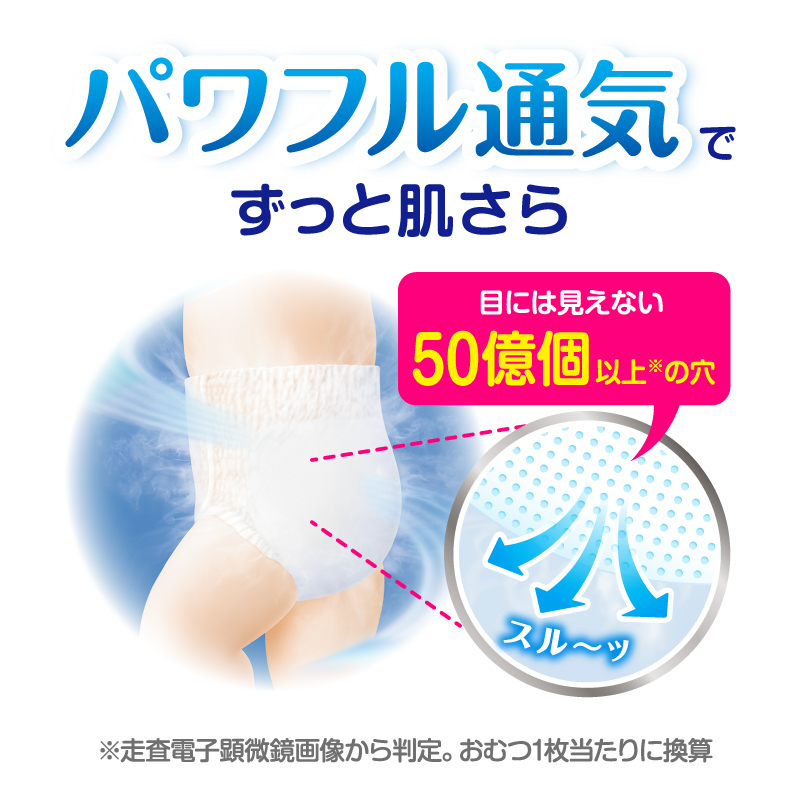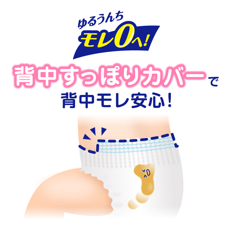 全面パワフル通気シートでおしっこ後もずっと肌さら!ふんわりエアインクッションで肌に触れる面もやわらか。 独自の凹凸シートでゆるうんちを広げず、さらに背中すっぽりカバーと足まわりの立体うんちストッパーですきまからのモレも防いでゆるうんちモレ0へ。 ウエストが2.5倍*ものびるからはかせやすく、ふんわりフィット。 *伸ばす前に対して(花王調べ)