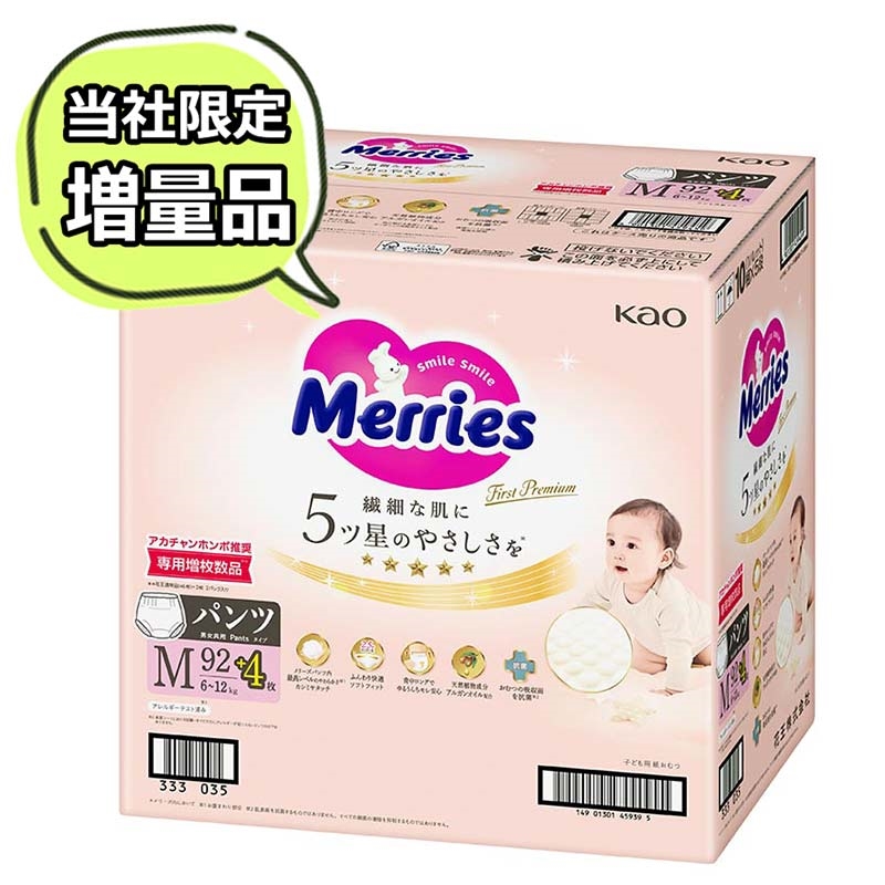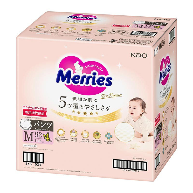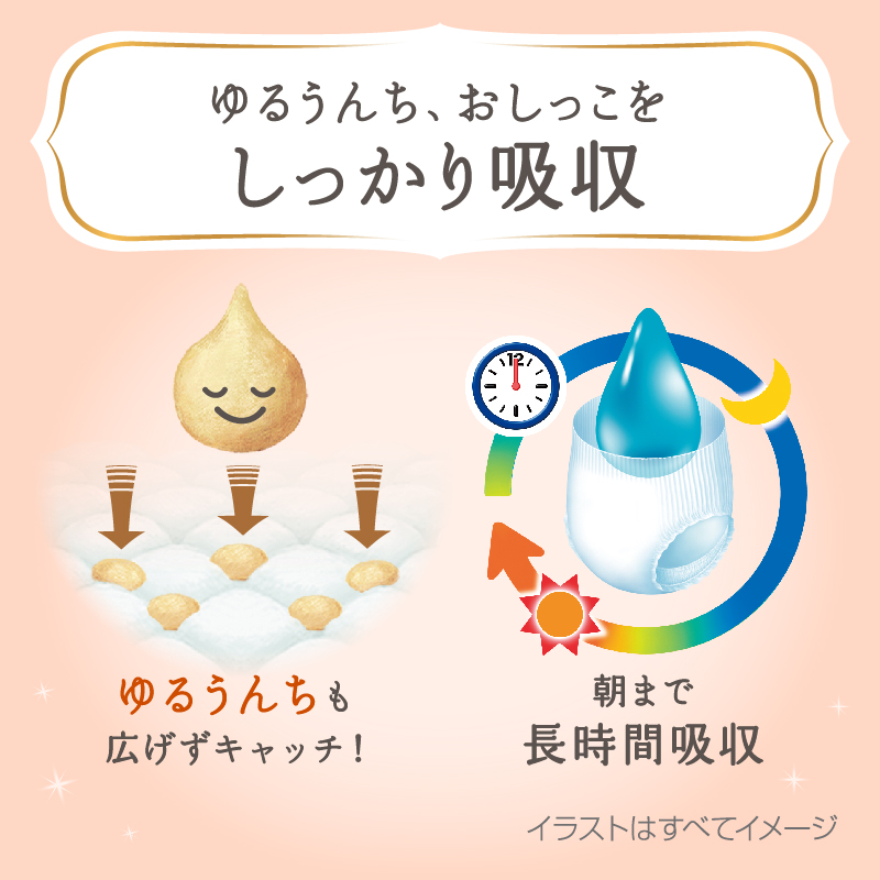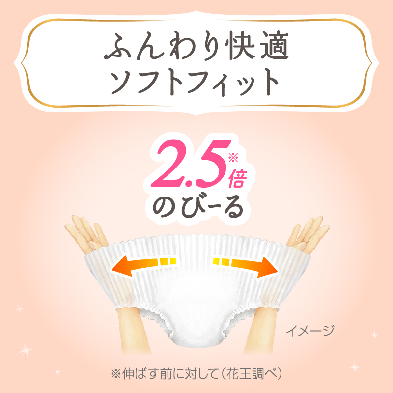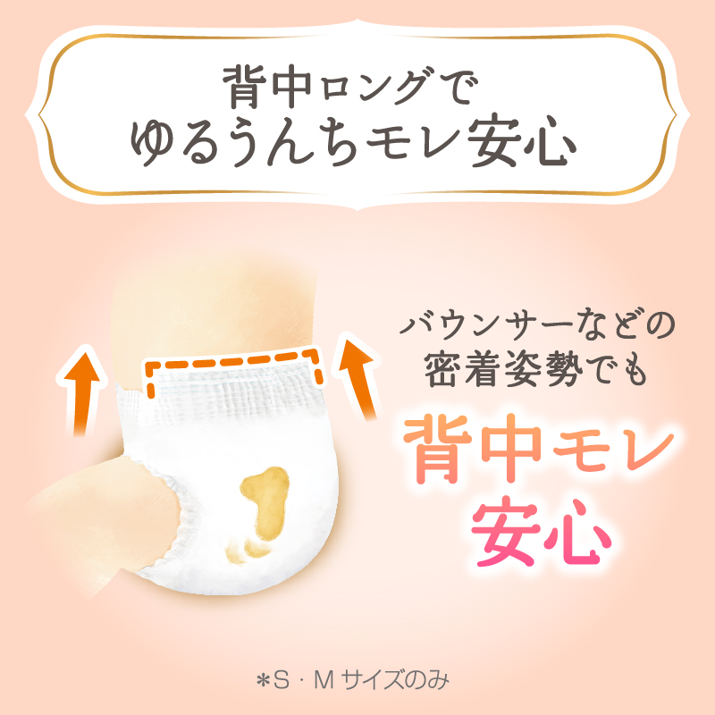 繊細な肌に5ツ星のやさしさを※ ※メリーズ内において ●メリーズパンツ内最高レベル※1のやわらかさ カシミヤタッチ ※1お腹まわり部分 ●ふんわり快適ソフトフィットで赤ちゃん快適&モレ安心 ●背中ロングでゆるうんちモレ安心 ●肌に触れる表面シートに、天然植物成分アルガンオイル配合 ●おむつの吸収面を抗菌※2 ※2肌表面を抗菌するものではありません。 すべての細菌の増殖を抑制するものではありません。