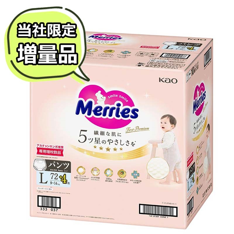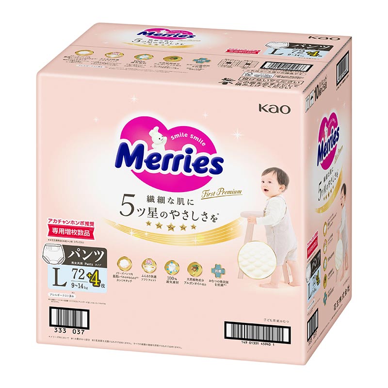繊細な肌に5ツ星のやさしさを※ ※メリーズ内において ●メリーズパンツ内最高レベル※1のやわらかさ カシミヤタッチ ※1お腹まわり部分 ●ふんわり快適ソフトフィットで赤ちゃん快適&モレ安心 ●背中ロングでゆるうんちモレ安心 ●肌に触れる表面シートに、天然植物成分アルガンオイル配合 ●おむつの吸収面を抗菌※2 ※2肌表面を抗菌するものではありません。 すべての細菌の増殖を抑制するものではありません。