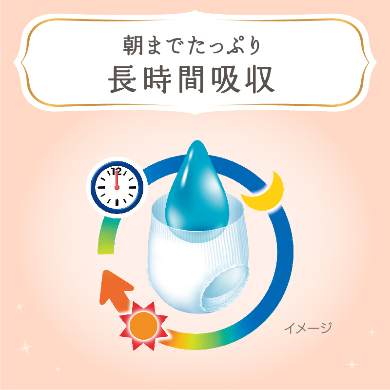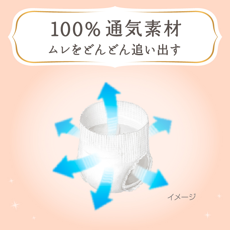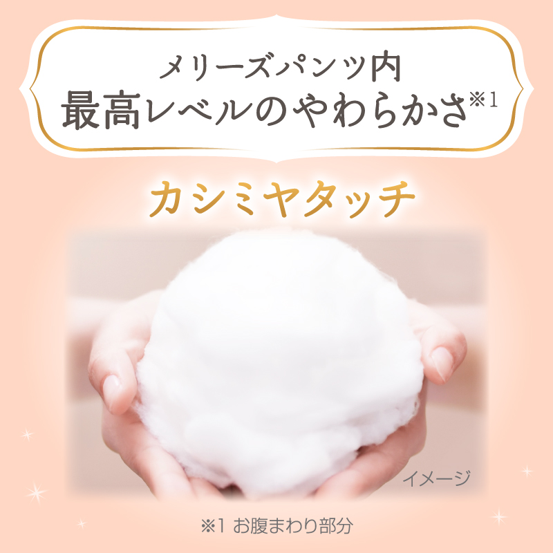 繊細な肌に5ツ星のやさしさを※ ※メリーズ内において ●メリーズパンツ内最高レベル※1のやわらかさ カシミヤタッチ ※1お腹まわり部分 ●ふんわり快適ソフトフィットで赤ちゃん快適&モレ安心 ●背中ロングでゆるうんちモレ安心 ●肌に触れる表面シートに、天然植物成分アルガンオイル配合 ●おむつの吸収面を抗菌※2 ※2肌表面を抗菌するものではありません。 すべての細菌の増殖を抑制するものではありません。