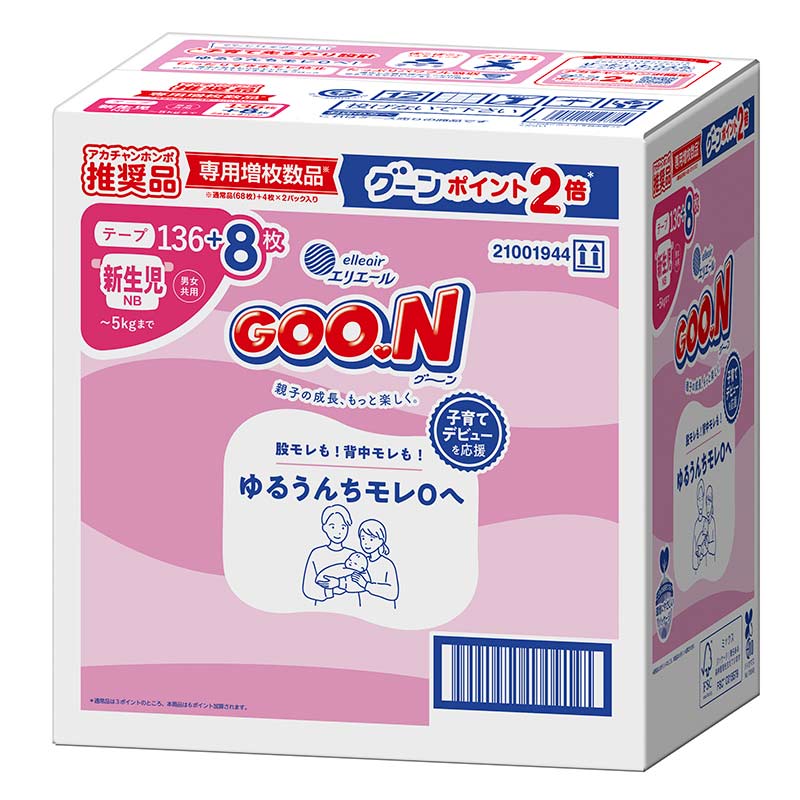 ●テープタイプ ●サイズ:新生児(~5㎏まで) ●136+8枚 ●ポリオレフィン系不織布、綿状パルプ、吸収紙、高分子吸収材、ポリオレフィン系フィルム、ポリウレタン、スチレン系合成樹脂等