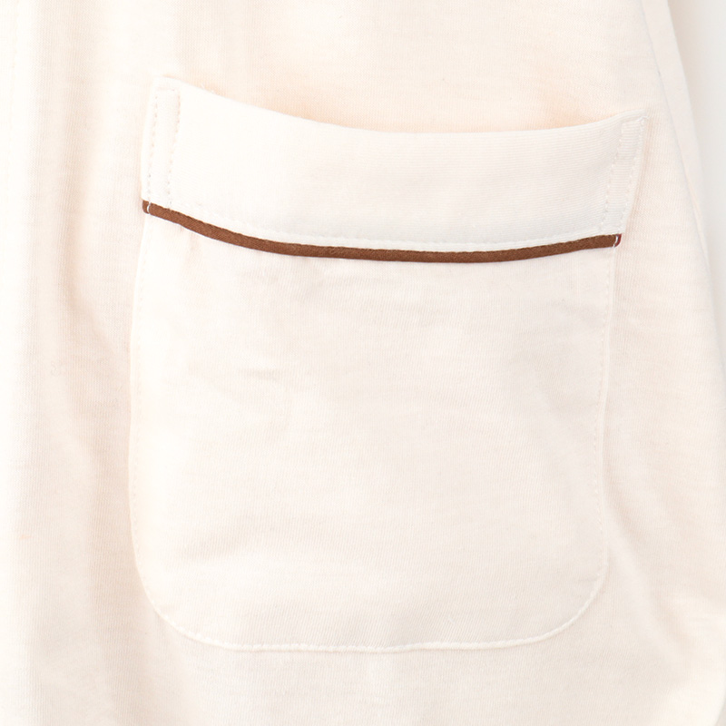 伸縮性のあるカットソー生地を使用しています。愛らしいスヌーピーが胸にあり癒されます。長めの丈のデザインで授乳口付ですので、産前から産後まで着用して頂けます。パンツのウエストにはウエスト調整ゴムを使用し、簡単に腹囲調節が可能です。
