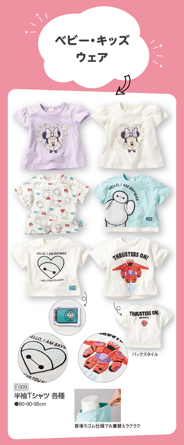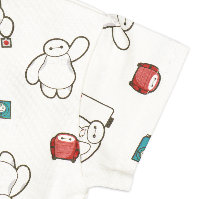 赤ちゃん本舗オリジナルデザインの半袖Tシャツです。ベイマックスのかわいい総柄デザインです。織りピスつきの限定仕様です。衿うしろはゴム入り仕様で着脱も簡単で、お子様のお着替えを応援します。普段使いからおでかけまで使えるアイテムです。