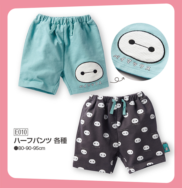 赤ちゃん本舗オリジナルデザインのハーフパンツです。ミニ裏毛素材のハーフパンツにベイマックスのお顔の総柄がかわいいデザインです。限定の織りピスネームもポイントです。 ウエストゴム仕様でお着替えも簡単です。普段使いからおでかけまで使えるアイテムです。