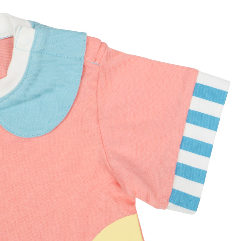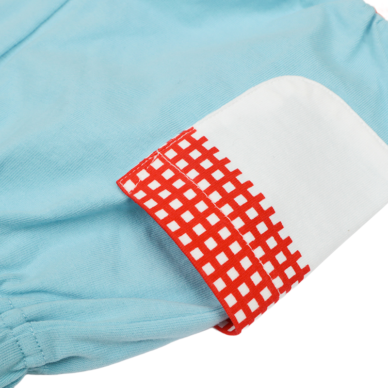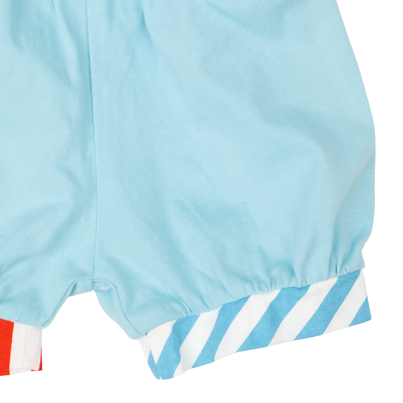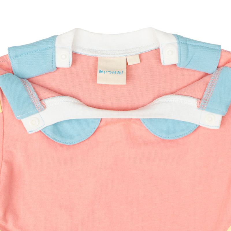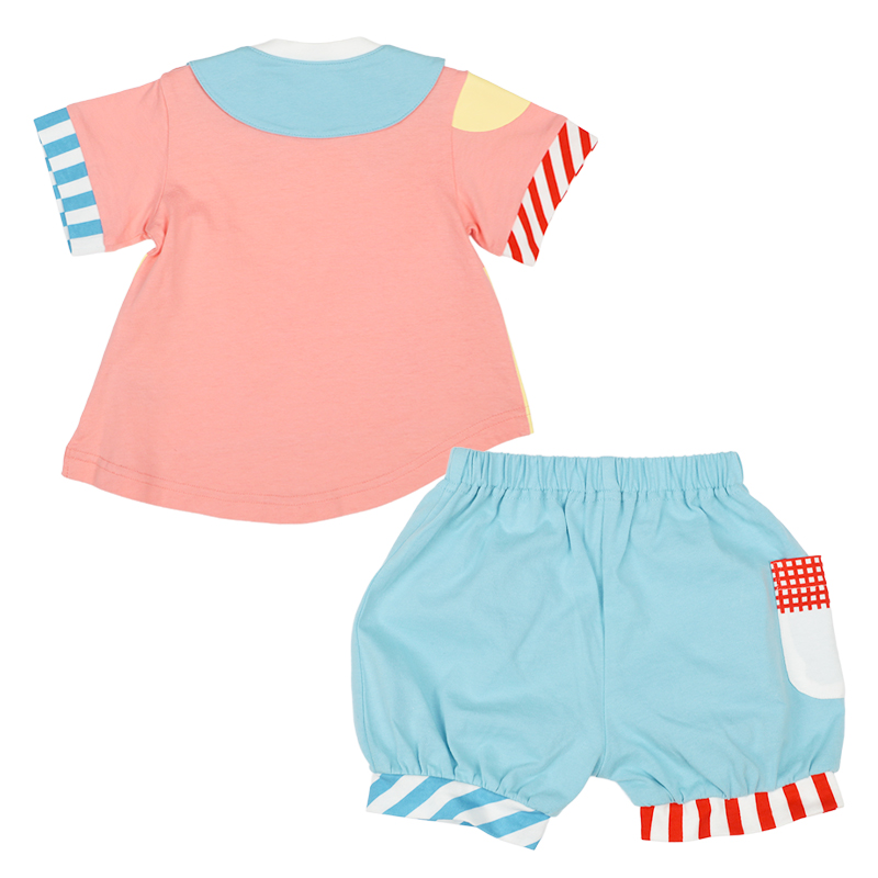 <商品サイズ> 80(身丈37・身幅27・肩幅23.2・袖丈26・股上18・股下6.5・腰まわり62・ウエスト38) 90(身丈39・身幅28・肩幅24・袖丈29.5・股上18.5・股下7・腰まわり64・ウエスト40) 100(身丈43・身幅30・肩幅25.5・袖丈33・股上19.5・股下8・腰まわり68・ウエスト44) <素材> <トップス> 本体 綿100% リブ部分 綿95%ポリウレタン5% <ボトムス> 綿100%