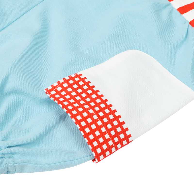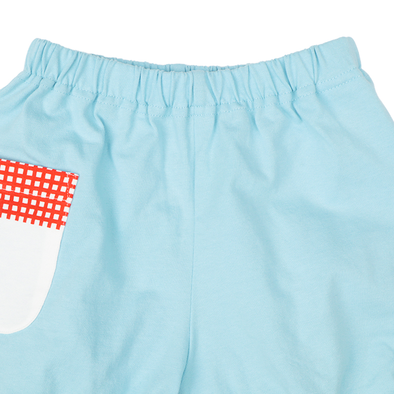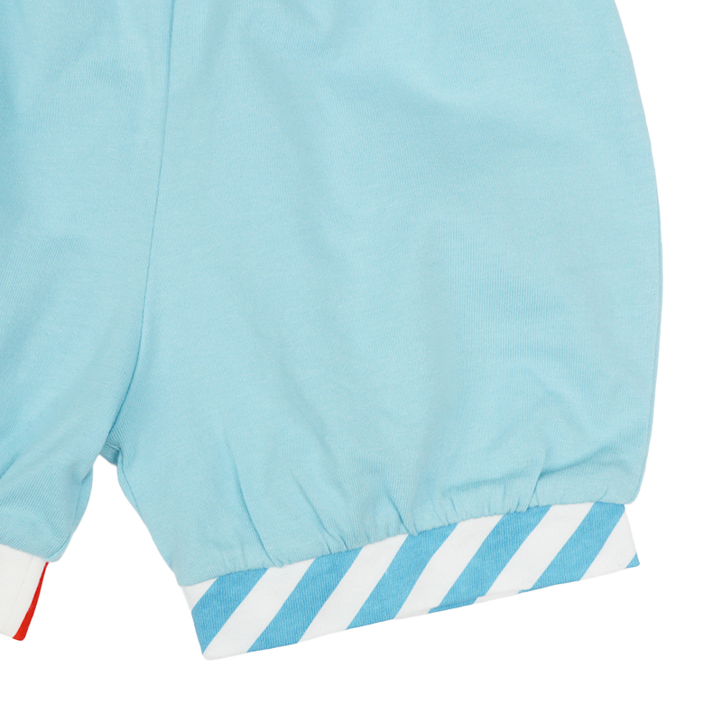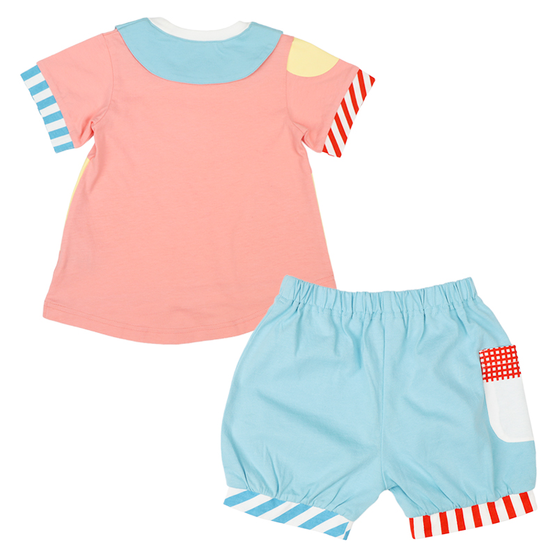 <商品サイズ> 80(身丈37・身幅27・肩幅23.2・袖丈26・股上18・股下6.5・腰まわり62・ウエスト38) 90(身丈39・身幅28・肩幅24・袖丈29.5・股上18.5・股下7・腰まわり64・ウエスト40) 100(身丈43・身幅30・肩幅25.5・袖丈33・股上19.5・股下8・腰まわり68・ウエスト44) <素材> <トップス> 本体 綿100% リブ部分 綿95%ポリウレタン5% <ボトムス> 綿100%