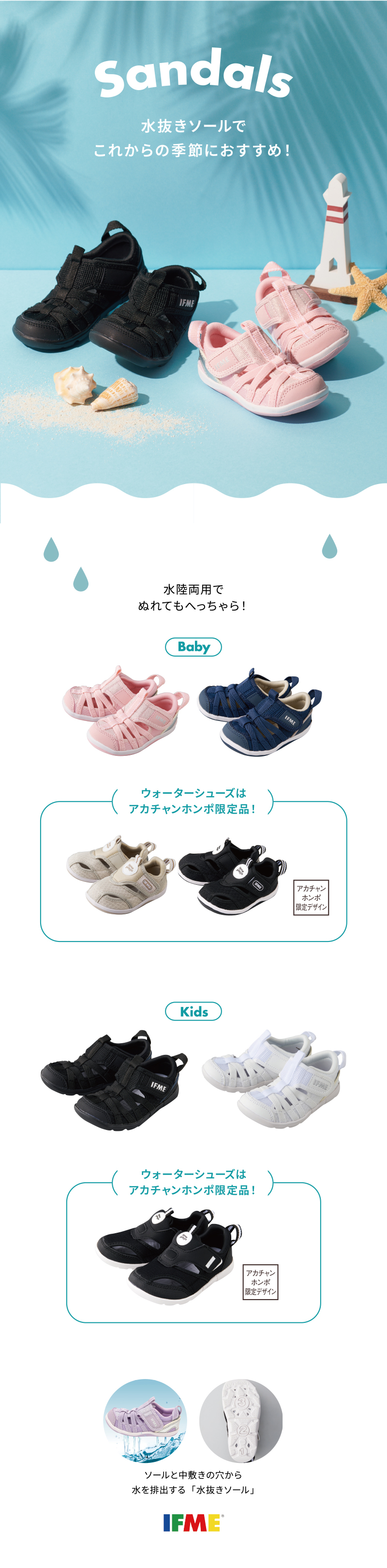 イフミーベビーサンダル。甲材料は通気性のよいメッシュ素材を使用。両開きタイプ、水抜きソール仕様。