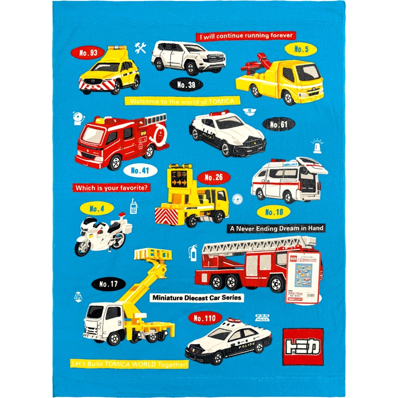 ●商品サイズ(約・cm):85×115 ●重量(約):342g ●素材:綿100% ●洗濯ネット使用 ●お名前タグ付き (C) TOMY 「トミカ」は株式会社タカラトミーの登録商標です。