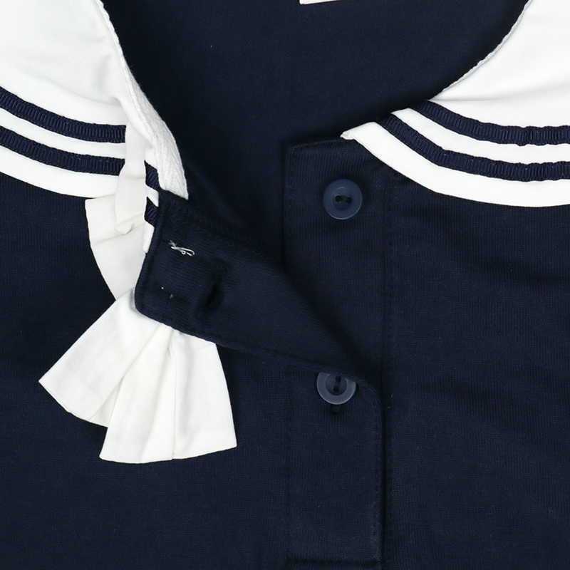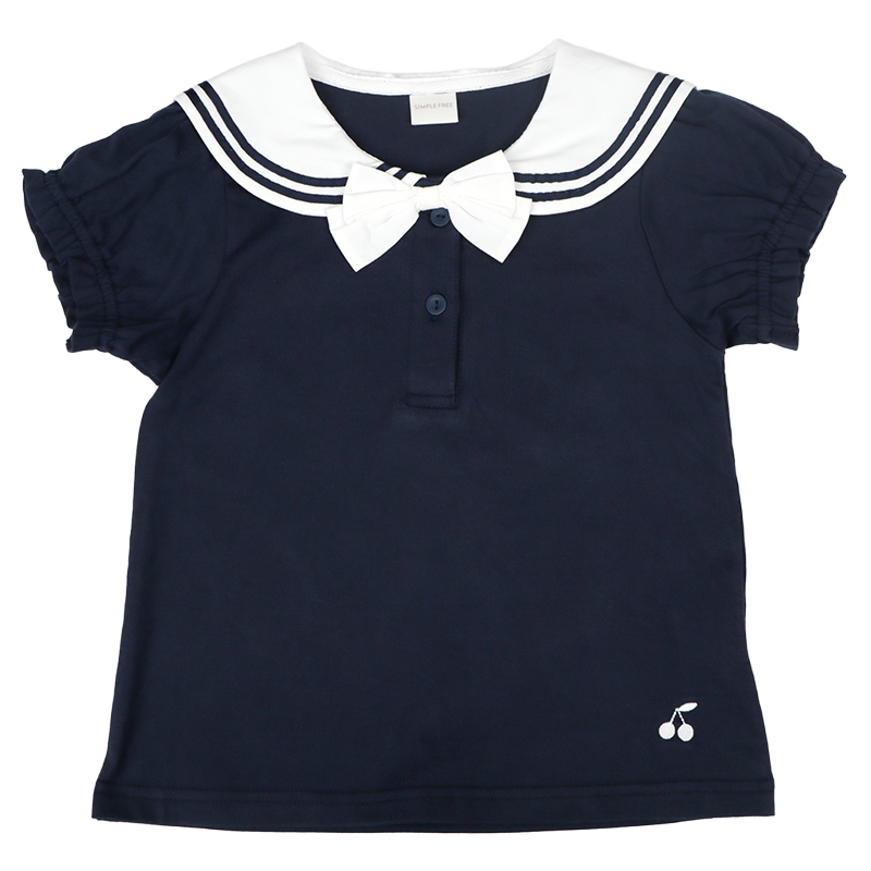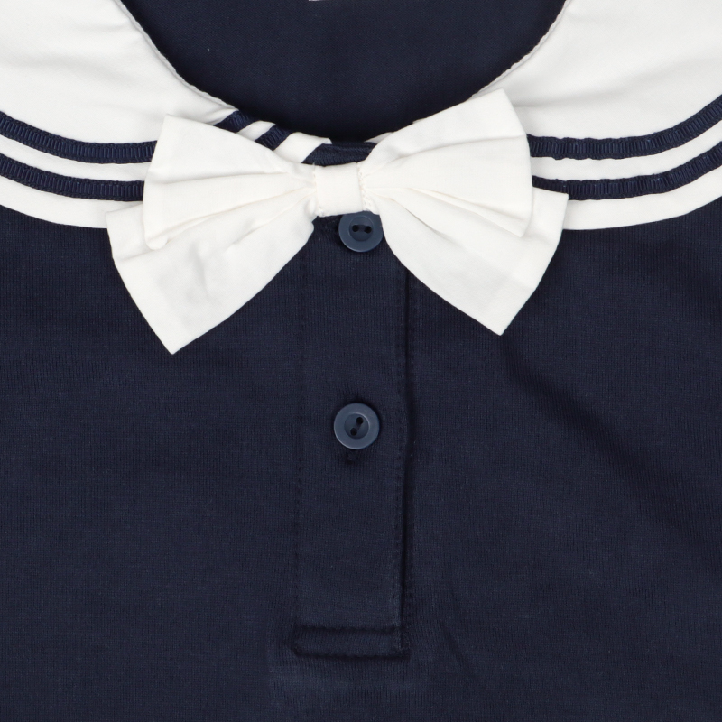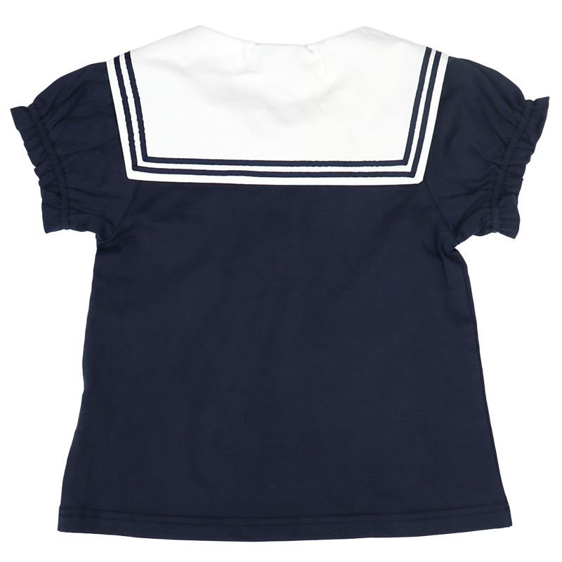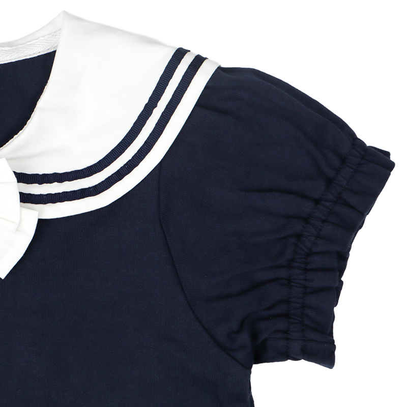 セーラーカラーは後ろ姿がよりかわいく見えるアイテムです。 胸元のリボンとパフスリーブがポイントです。 サイズは80~120と幅広くご用意をしているので、お子様の成長にあわせてぴったりのサイズをお選びいただけます。 姉妹でお揃いコーデも楽しめます。 お名前ネーム付きです。