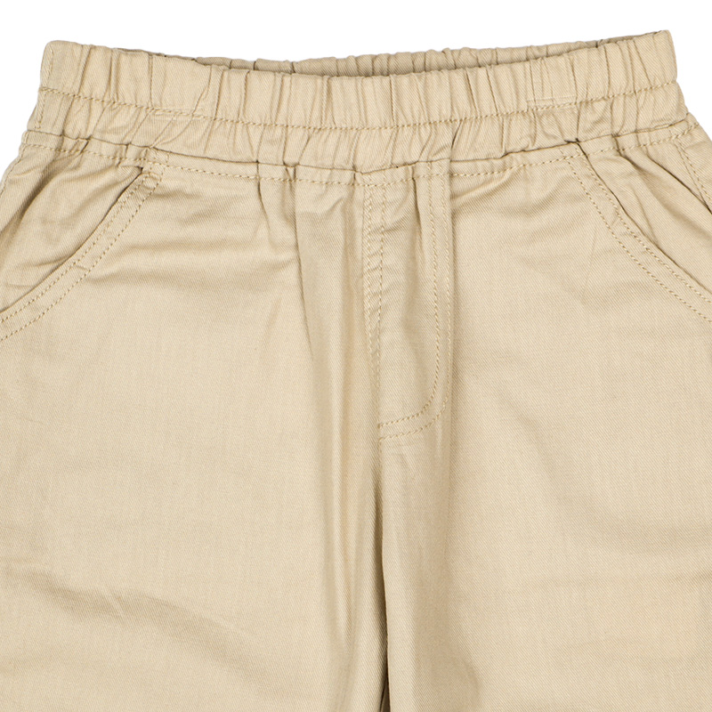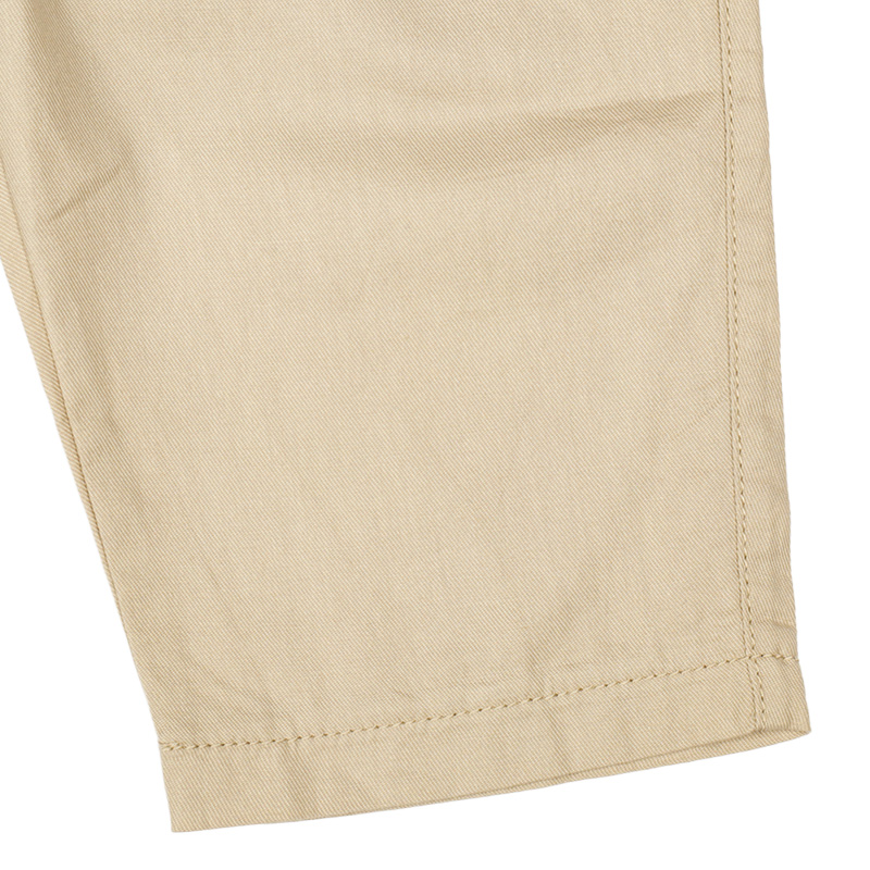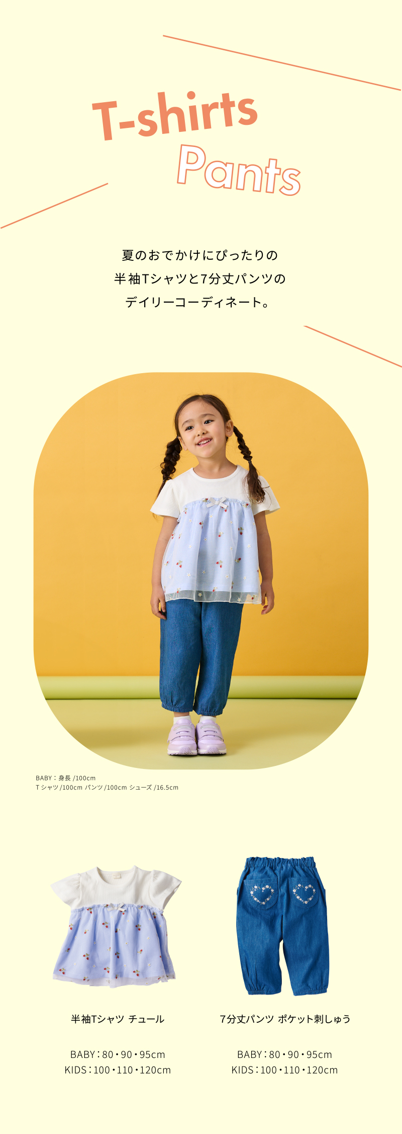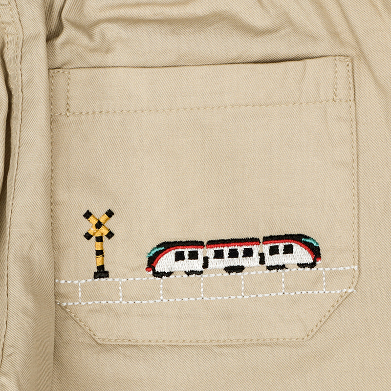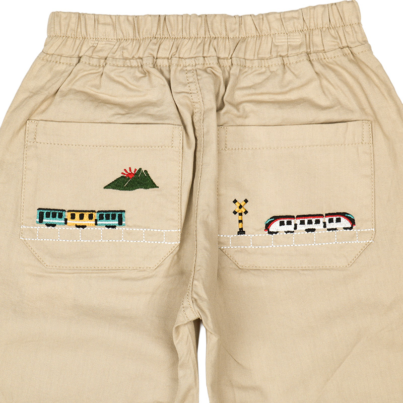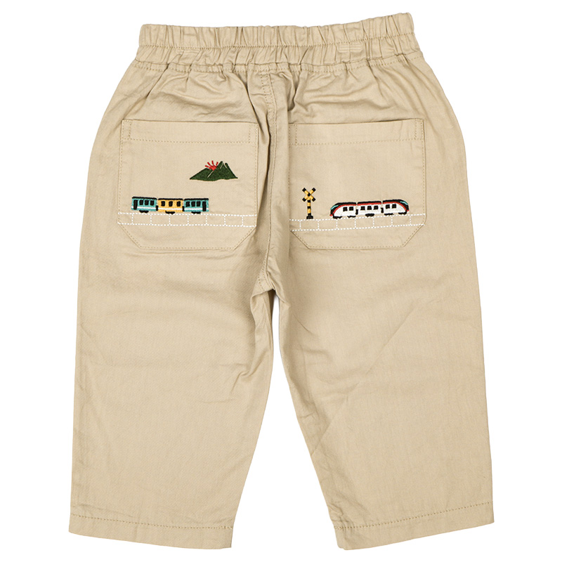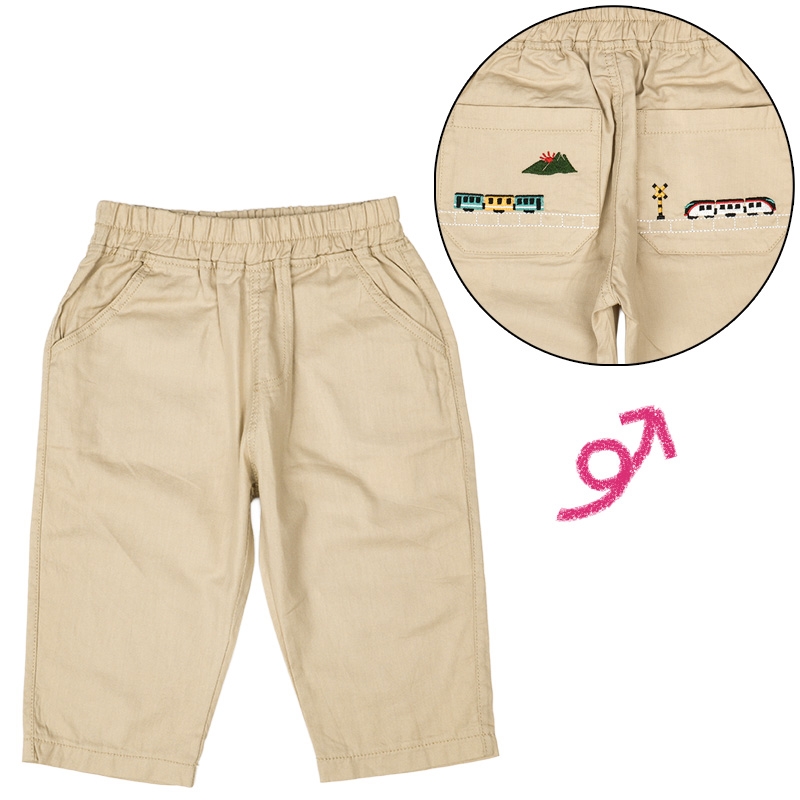 ヒップポケットのモチーフ刺しゅうがポイントの7分丈パンツです。動きやすい、硬くない薄手のデニムと布帛生地を使用しました。ベーシックなカラーなので、色々なトップスとの相性も良く、便利な1枚です。名前が書けるお名前タグ付きです。