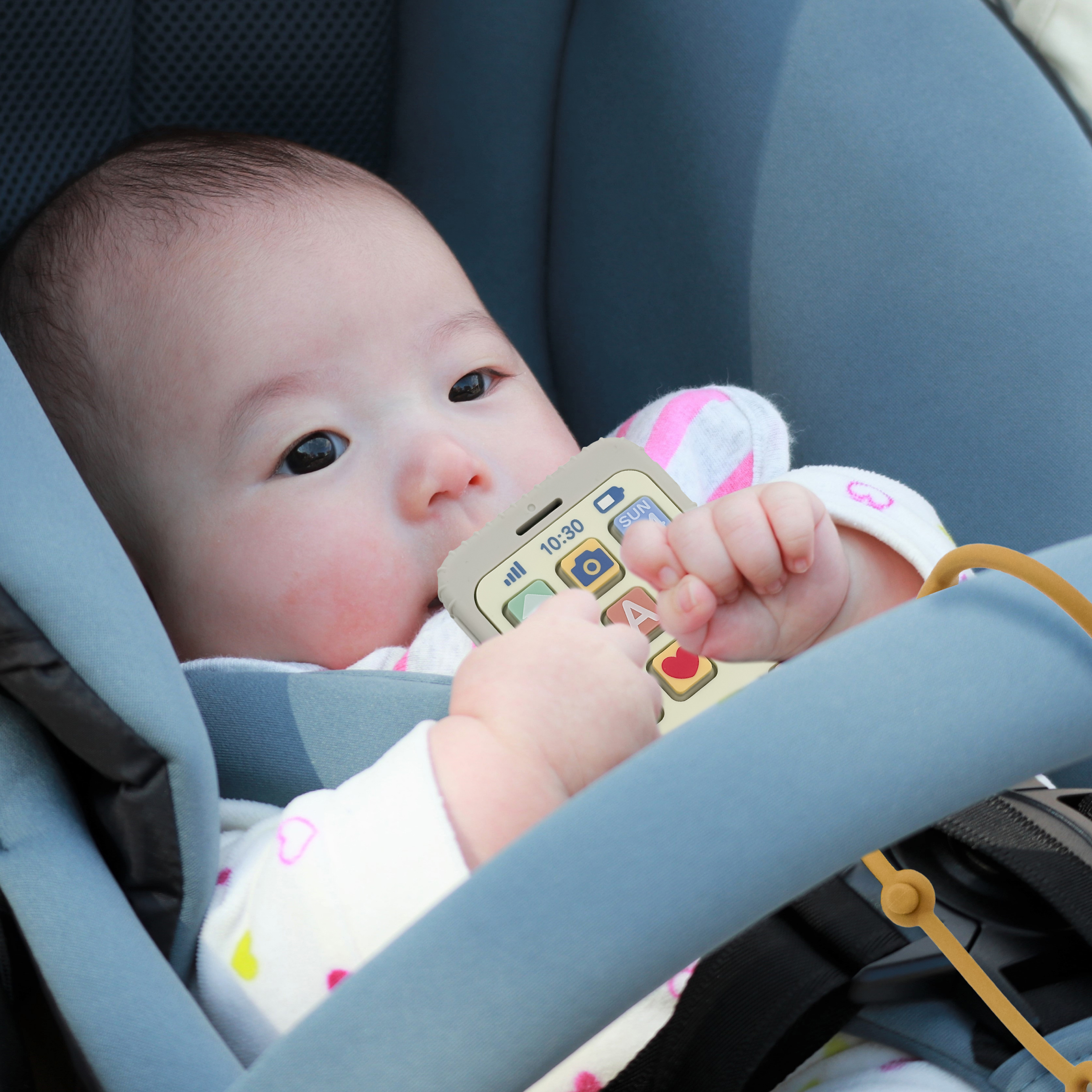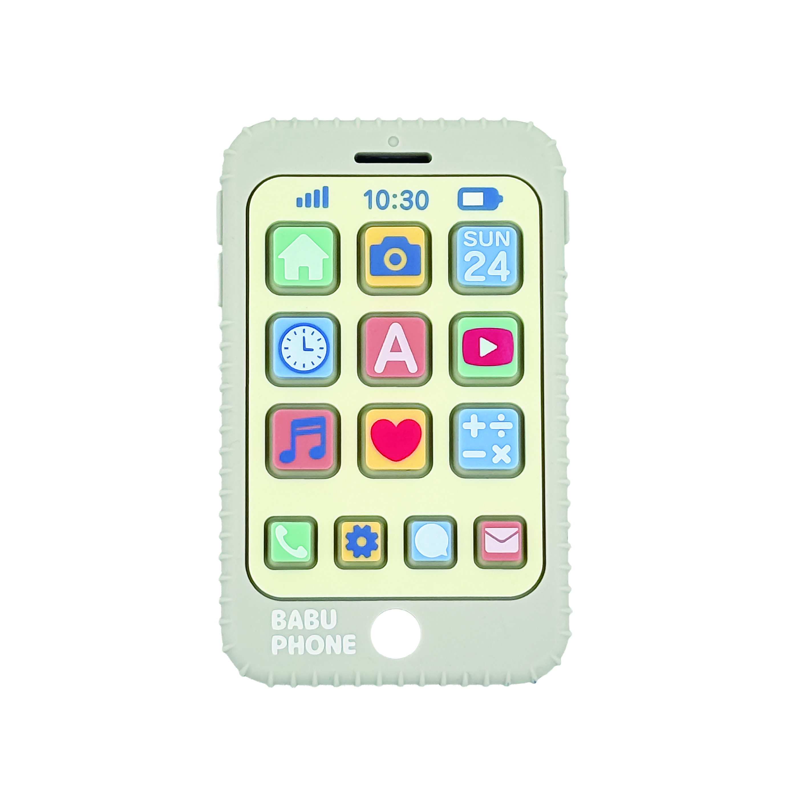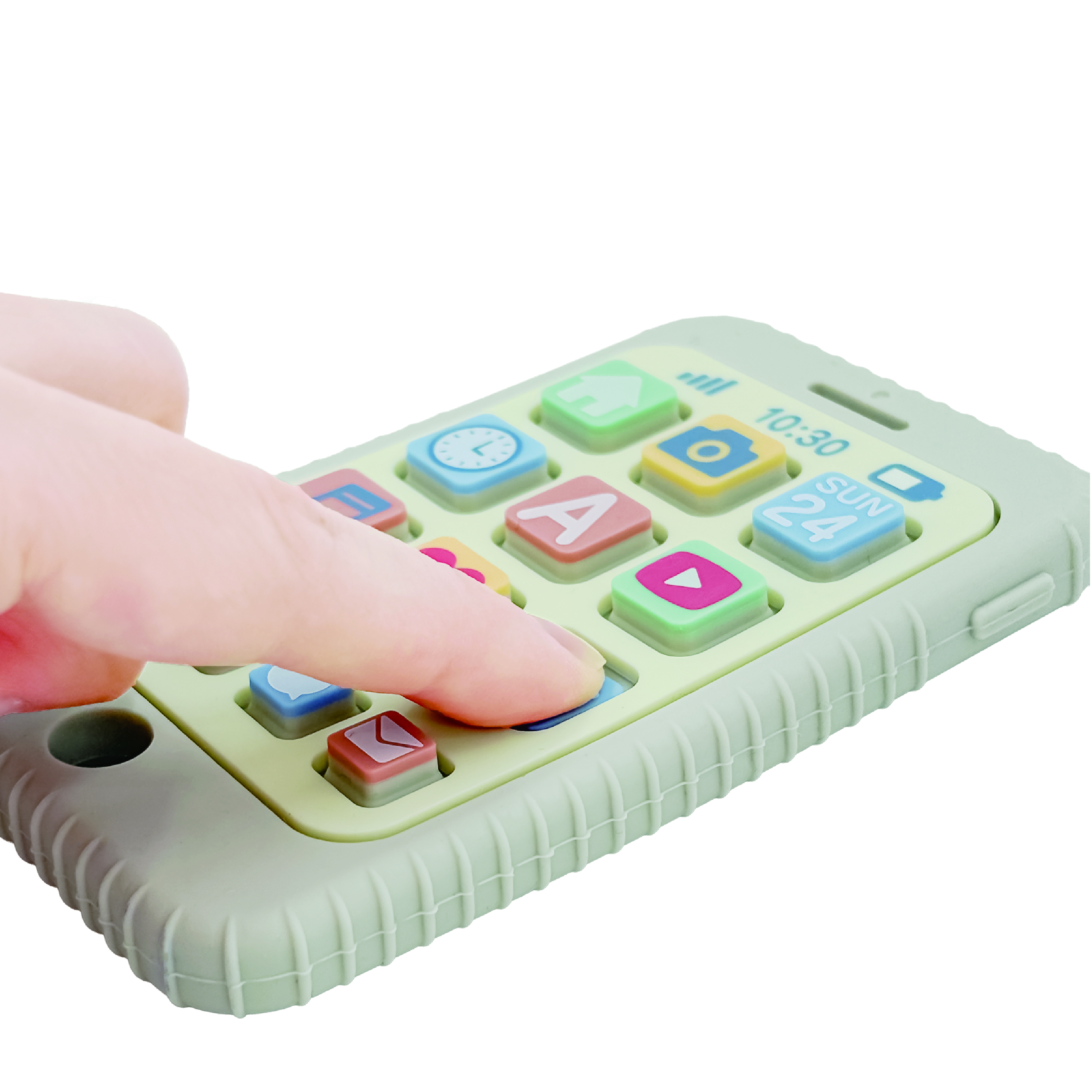 リアルなスマホ型。ニギニギ、ポチポチ、アプリ部分が沈み込む!カミカミして歯固めに。 指先を動かして脳を育み、ベビーの「やりたい!」を叶える知育おもちゃです。 シリコンなのでぶつかっても痛くない柔らかさと丸洗いできる清潔さを兼ね備えてます。 食洗機にも対応。
