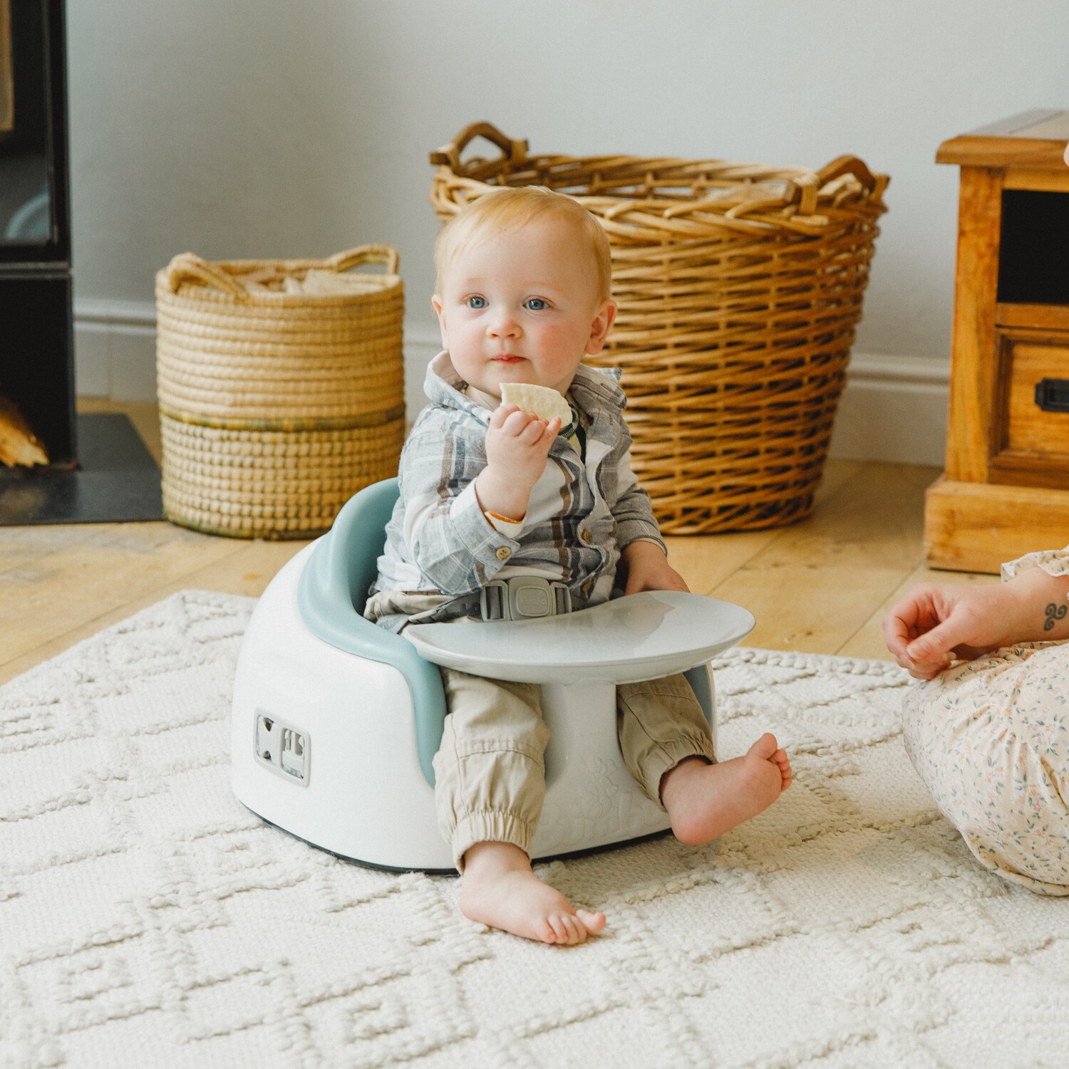 赤ちゃんのすわるをきちんと考えた、世界中で愛されるバンボ! バンボマルチシートはお子様の成長やシーンに合わせて床置きイス、 大人用のイスの座面に取り付けて使用する、お子様専用の補助イスです。 成長やイスと机の距離に合わせて、工具なしで4cmの高さ調節が可能。 大人用イス固定ベルト付。 大人と一緒のイスでハイチェア代わりにも。 箱から出してすぐ使えます。 高品質なポリウレタンフォームを使用したクッションシートはイスに隙間なくフィット、 カーブがおしりにフィットして快適な座り心地です。 収納可能な専用トレイ付。片手で付け外し可能です。 席時に子どもの手の届かない場所に位置に収納できて安心、 トレイを取付けている間も座面の安定性を損ないません。 脚回りゆったりで幅広いお子様に対応。 座面が平らで自分で座ったり、立ったりしやすく自立心を養います。