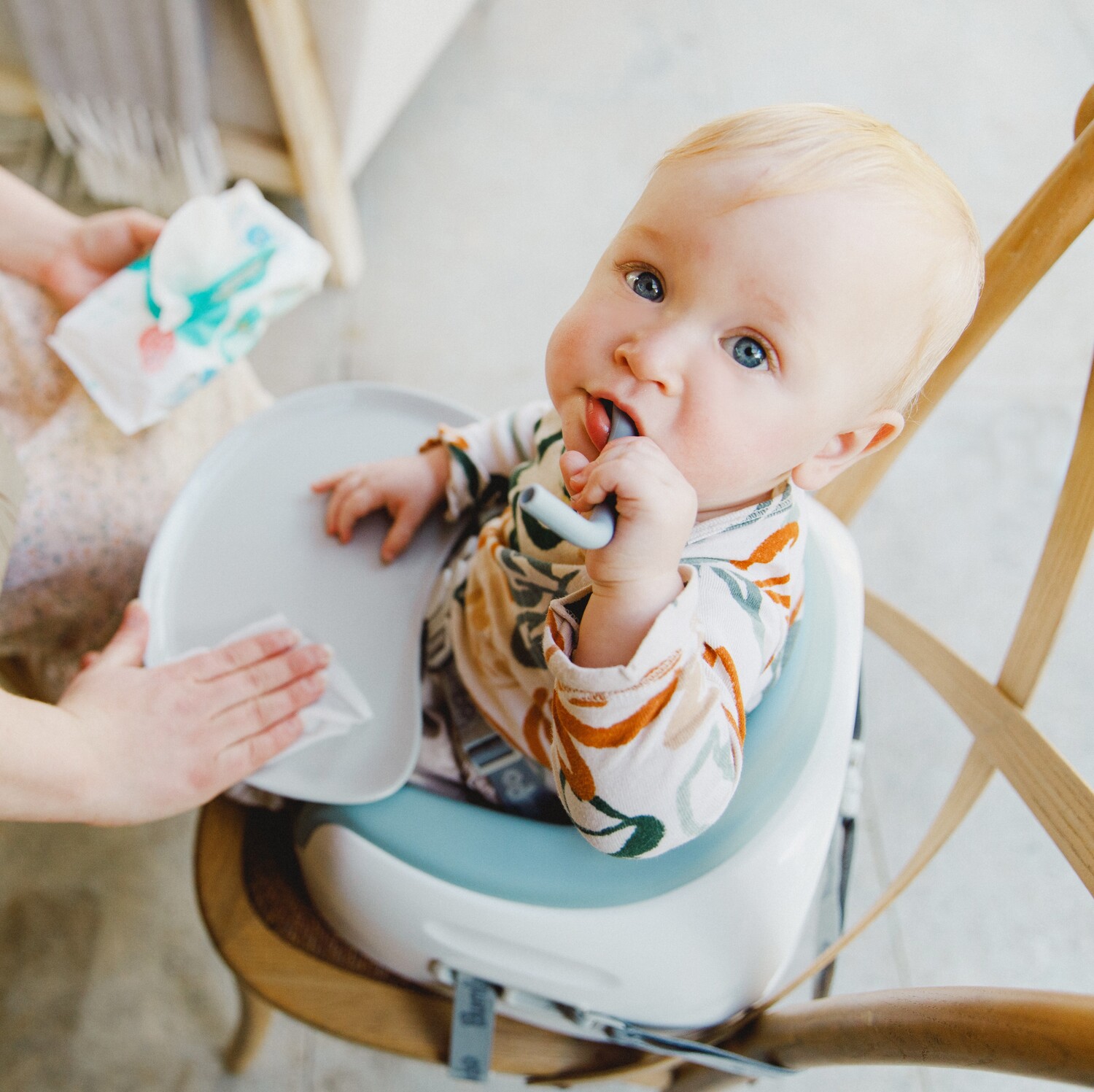 片手で簡単に付け外しができ、子どもの手の届かない位置に収納できて安心。トレイを取り付けている間もイスの安定性は損ないません。