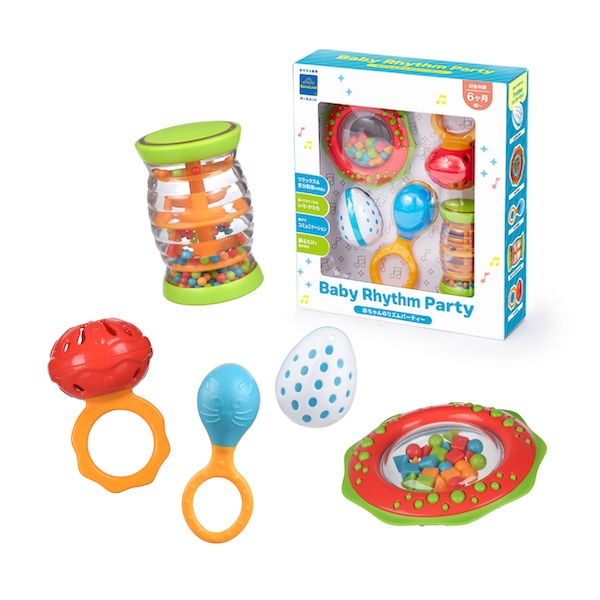 ●対象年齢:6ヵ月~ ●パッケージサイズ:W220×D70×H250mm ●重さ:400g ●セット内容:エッグシェイカー×1、ケージベル×1、ベビーレインボーメーカー×1、ミニマラカス×1、エッグシェイカー×1 ●素材:ABS、ポリプロピレン、ポリエチレン、フタル酸フリーPVC