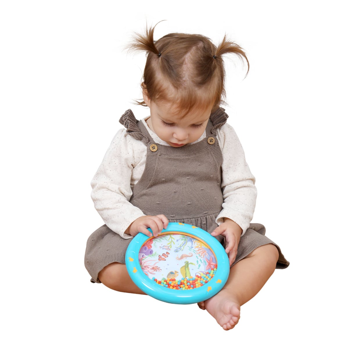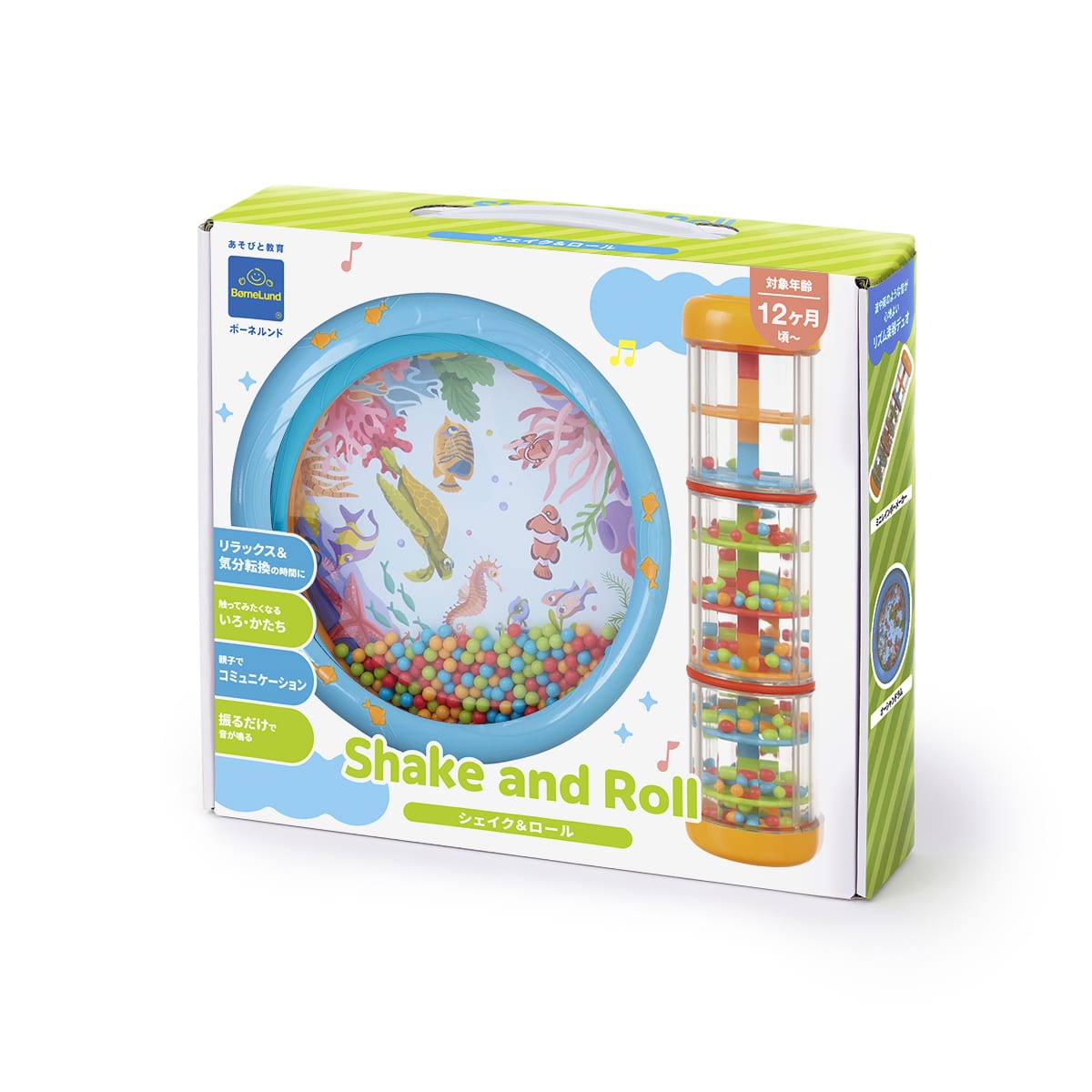 ●対象年齢:12ヵ月~ ●パッケージサイズ:W250×D55×H215mm ●重さ:400g ●セット内容:ミニレインボーメーカー×1、オーシャンドラム×1 ●素材:ABS、PET、ポリエチレン、シリコン