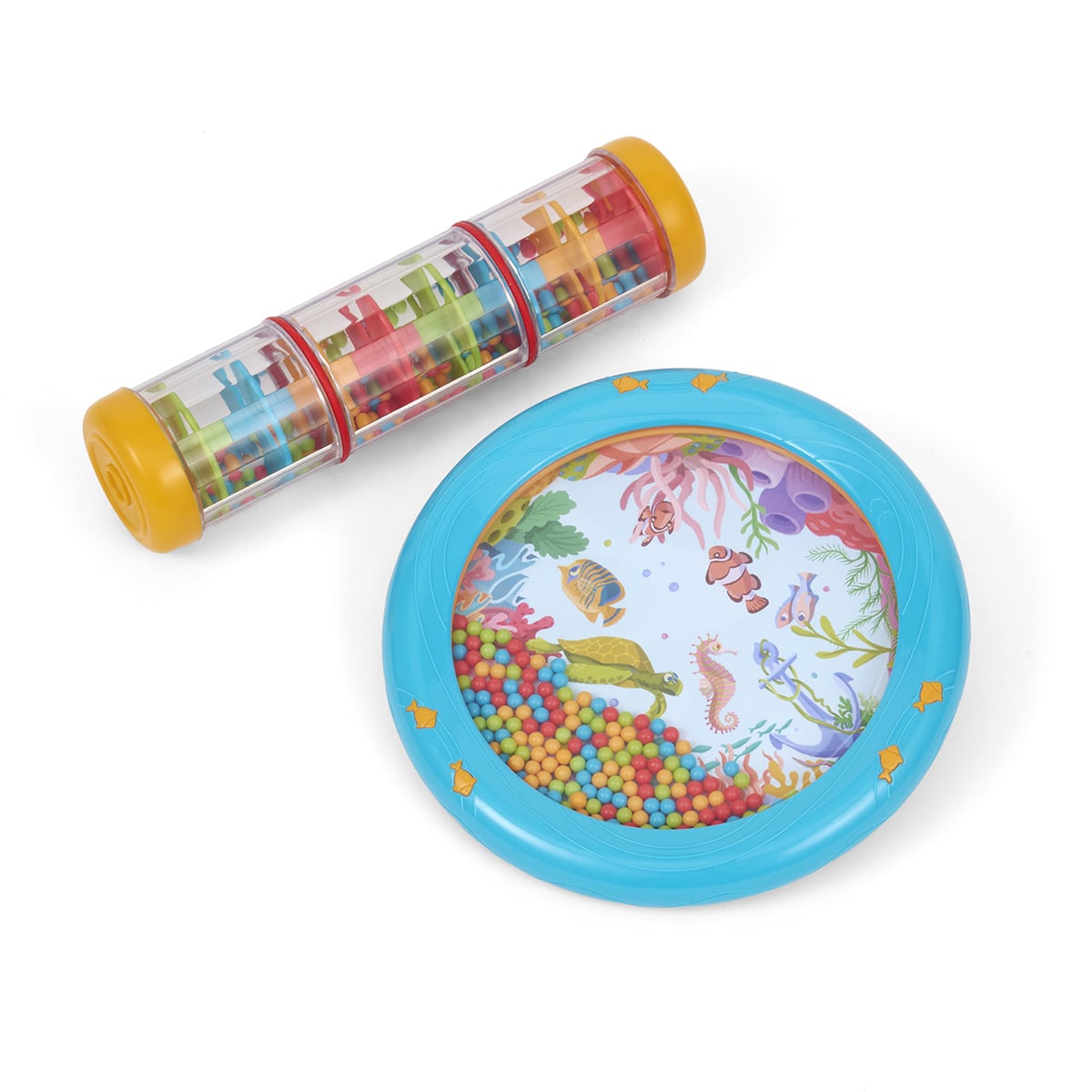 サラサラとした音色が心地よいシェイカーセット! 波や雨のような音が心地よいリズム楽器デュオ。赤ちゃんのリラックスとリフレッシュに使える親子の味方です。 ・ミニレインボーメーカー 無数のビーズは雨のような心地よい音。胎内で聞こえていたママの血流の音に似ていて、安心できる音色です。 ・オーシャンドラム 大きく平らな太鼓に豆や砂・小石などを入れた、舞台音楽用のパーカッションが原型。不規則で自然な波のような音色です。