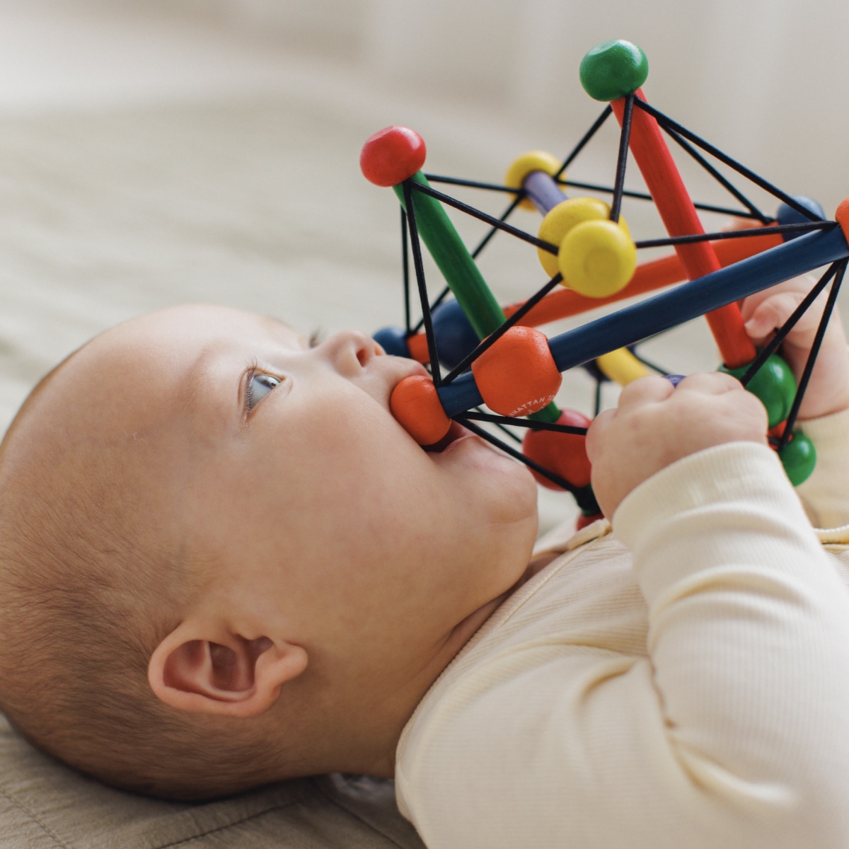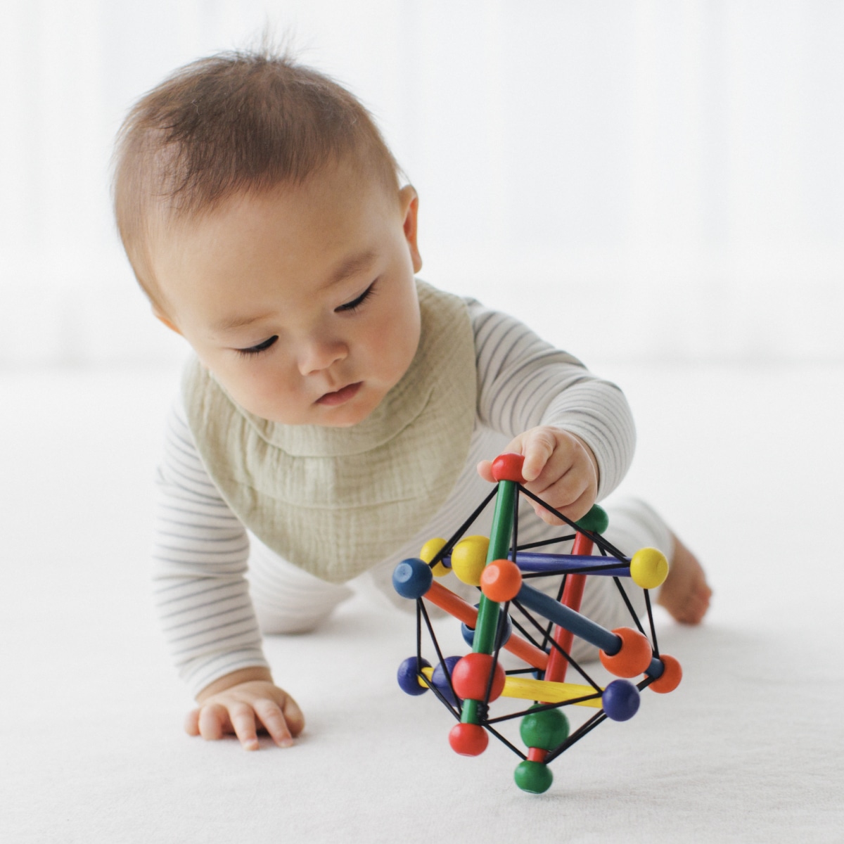 握って転がして、音も楽しい木製ラトル! 1歳ごろまでの手指の発達にあわせて長く遊べるスクィッシュは、マンハッタントーイ社のロングセラー。 小さな手でも握りやすいデザインと、どこから力を加えてもつぶれ、元に戻る様子が赤ちゃんの好奇心をくすぐります。振ると木のぶつかりあうコロコロという音が、耳への優しい刺激になります。