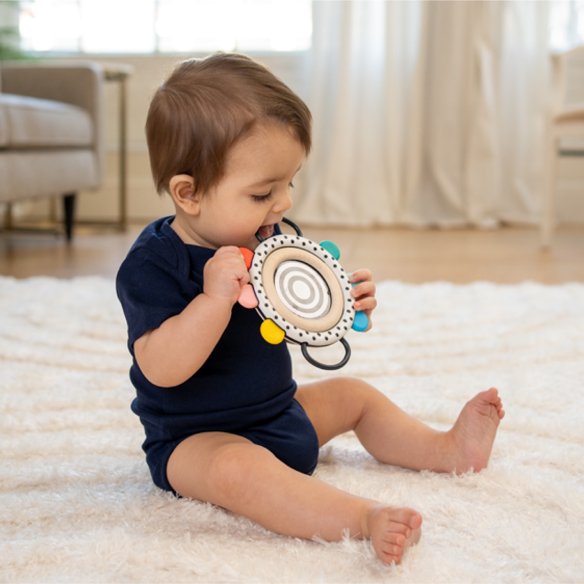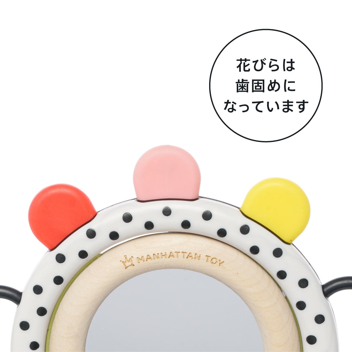 見て、握って、あそべるベビーミラー! 見て、つかんで、自分を発見する。はじめての自己認識を育むベビーミラー。 握りやすいハンドルが付いていて、手で握る→見る→動かすの連動を促し、感覚統合を育てます。花びらのような飾りは歯固めにも使えます。鏡をとおしてママやパパがいろんな表情を見せてあげることで、それをまねしようとして表情が豊になっていきます。タミータイム(うつぶせ遊び)にもぴったり。向かい合ってミラーを使い、交互に顔を映してみましょう。