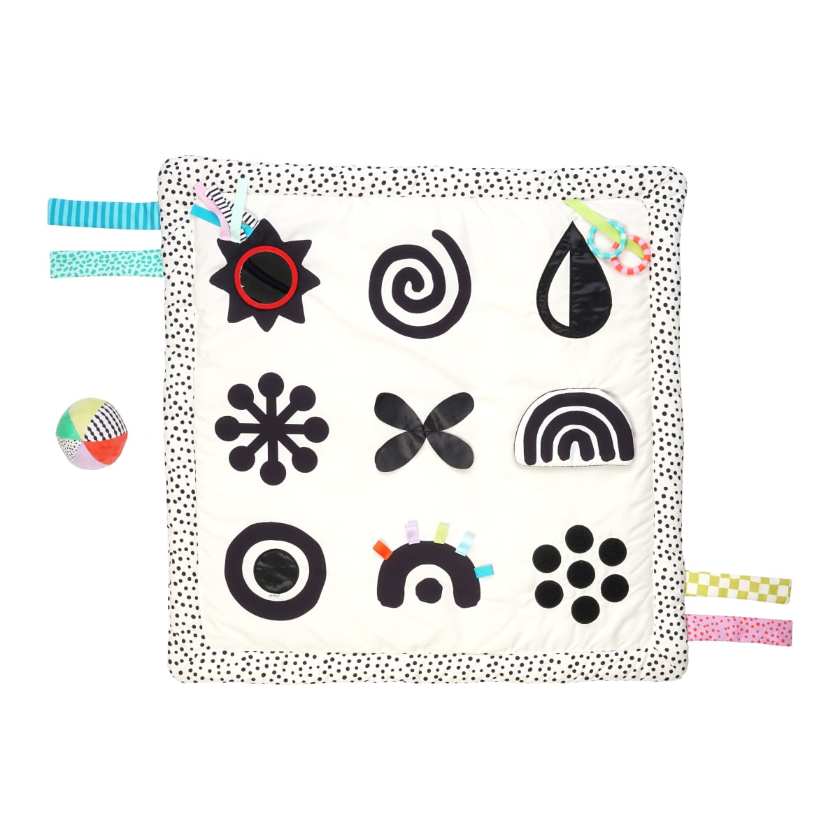 色や模様、音や感触を楽しむプレイマット! うつぶせになって顔を上げられるようになった頃におすすめのプレイマットです。 白黒のはっきりした図柄を、赤ちゃんは寝転びながら見つめます。音を鳴らしながらリングを左右に動かす追視あそびで、グラグラしていた首も少しずつ安定してきます。自分で姿勢を支えられるようになってからは、鏡をのぞき込んだり、パリパリする部分を触ったり。 はじめての寝返りやおすわりの練習もこのマットの上で。正方形でたたみやすいので、おむつ替えの時はさっと取り出せて重宝します。面ファスナーで取り外しができるミラーが付いていたり、リングが付いているので、ずりばいやはいはいの練習も楽しくなります。