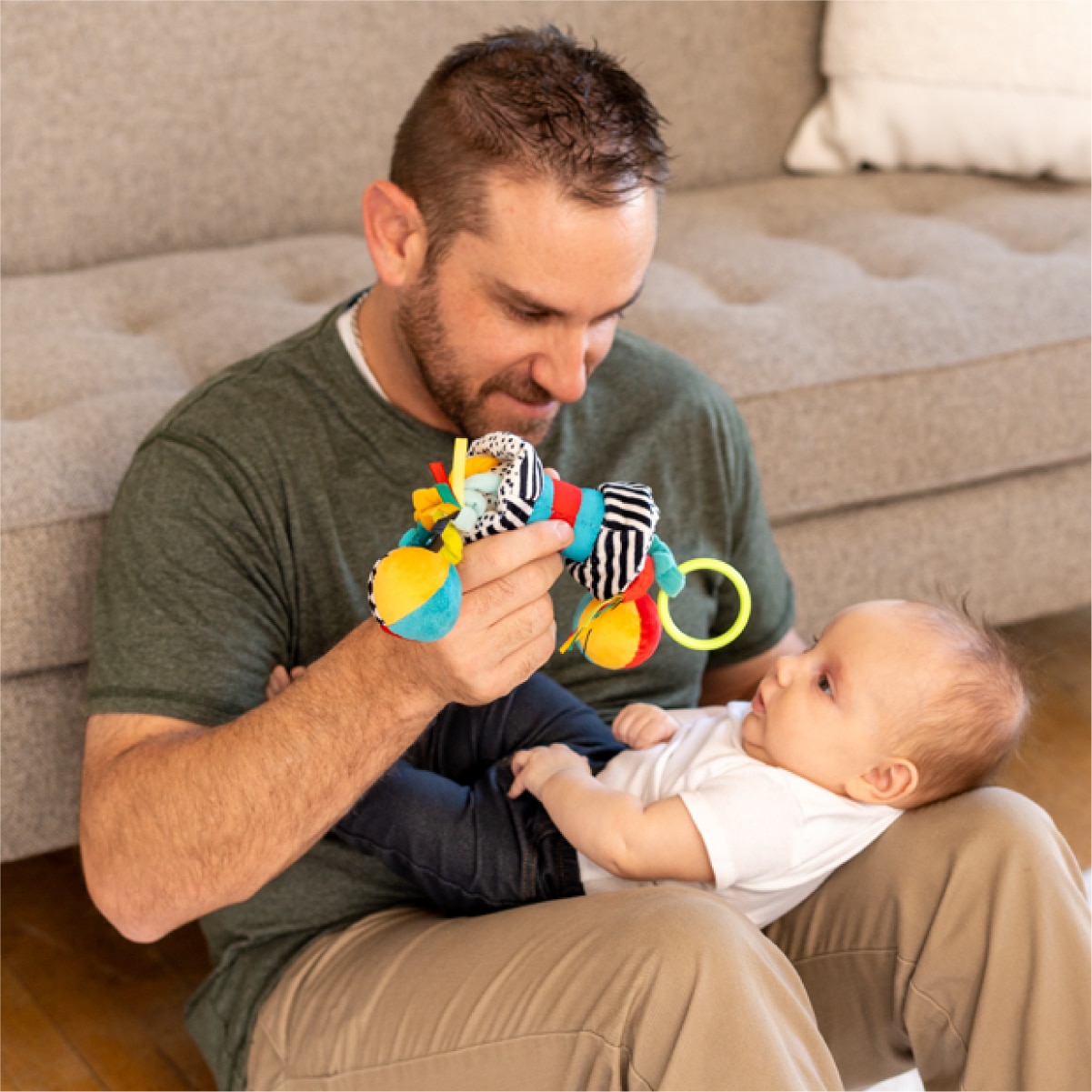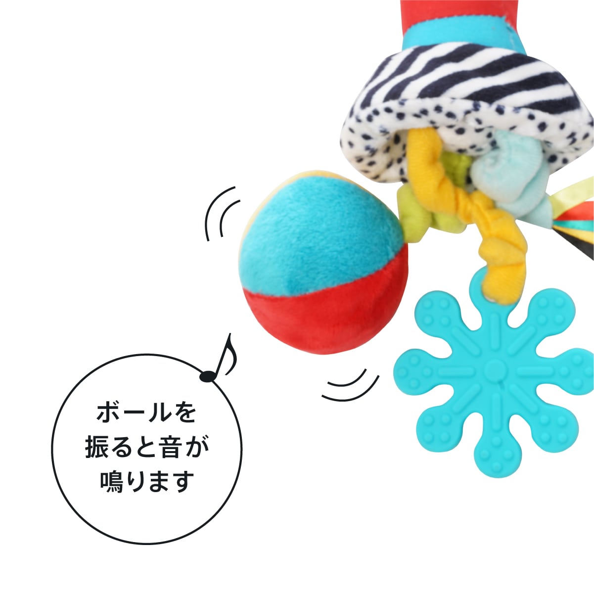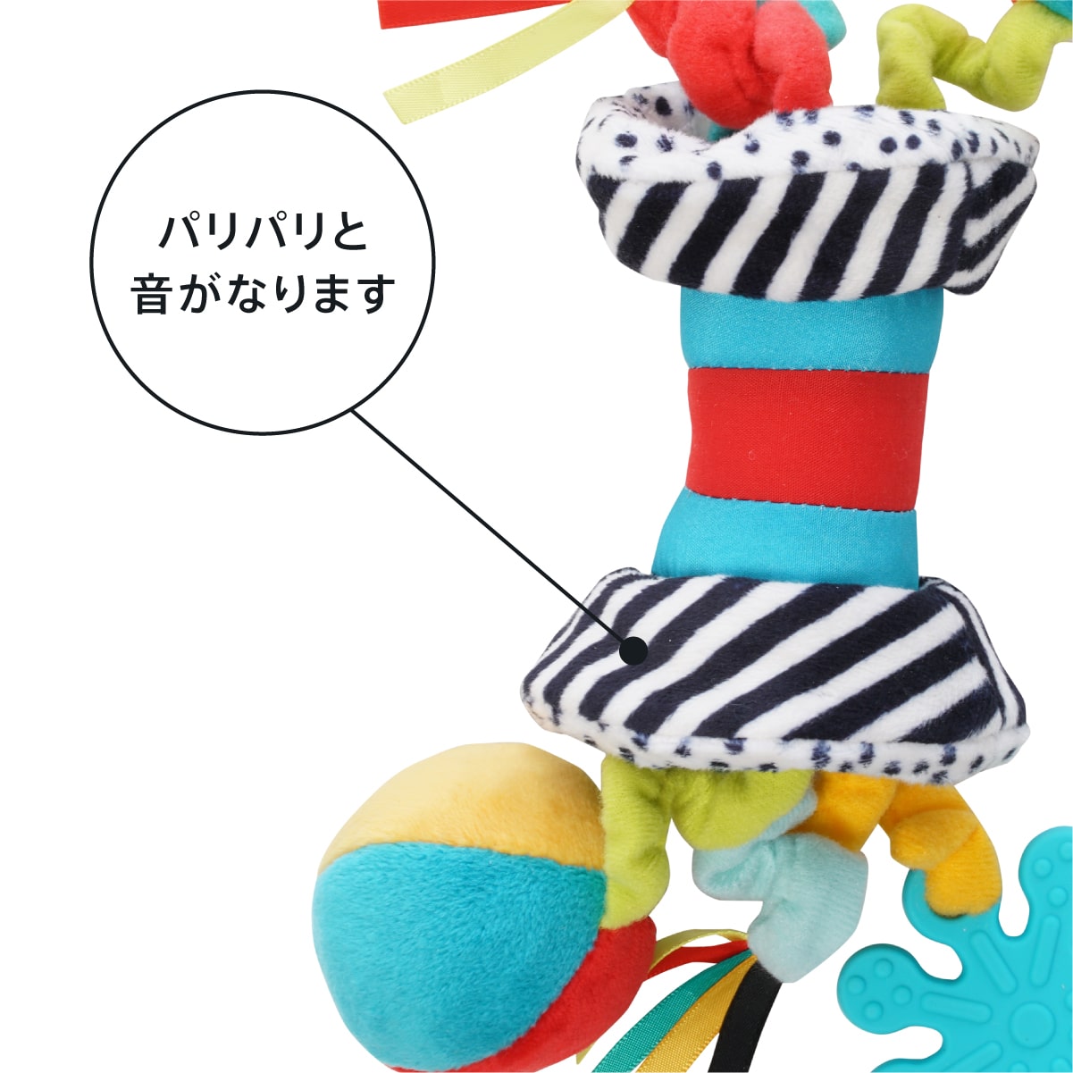 五感で楽しむセンサリートイ! 握る場所をコントラストの強いデザインがガイドしてくれる、五感で楽しむセンサリートイ。 手を伸ばして握ることができたら、ひっぱる、まわす、口に入れるなど、多様な動きが自然に生まれます。 ストライプと水玉の布地はパリパリと大きな音と感触。めくったり、ひっくりかえすのも楽しいですね。