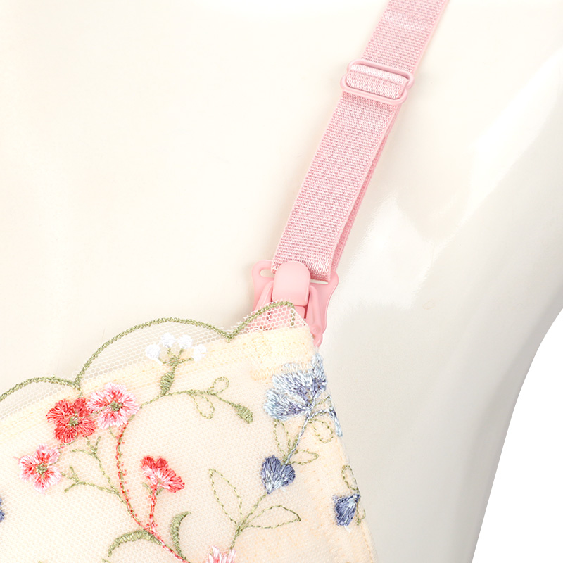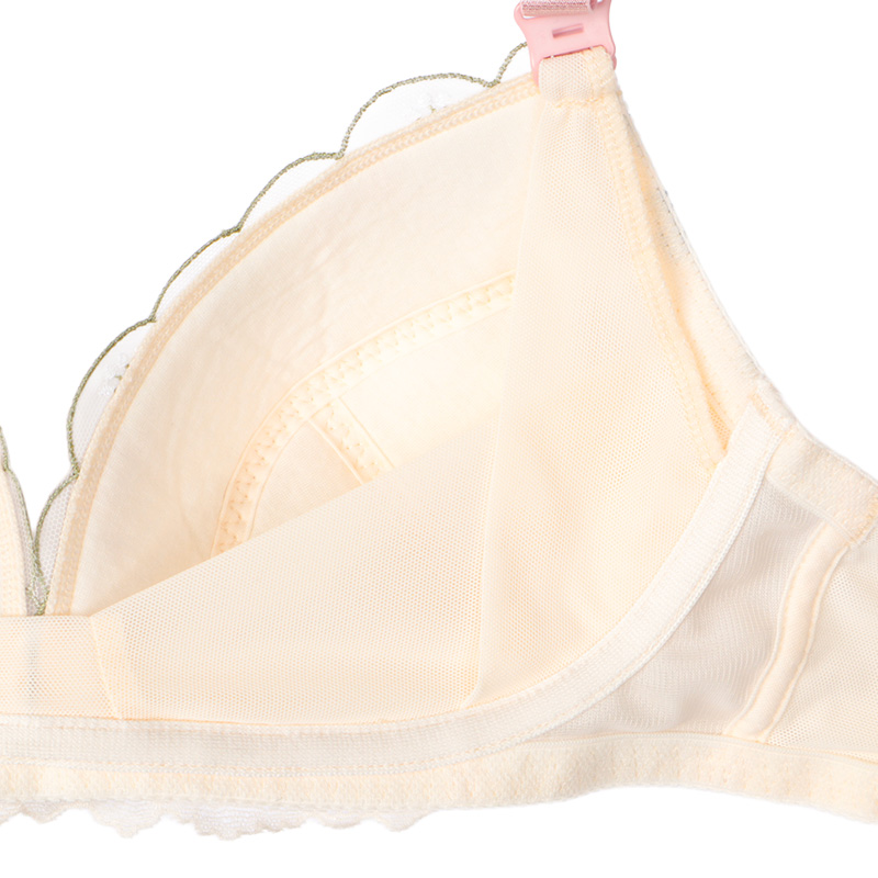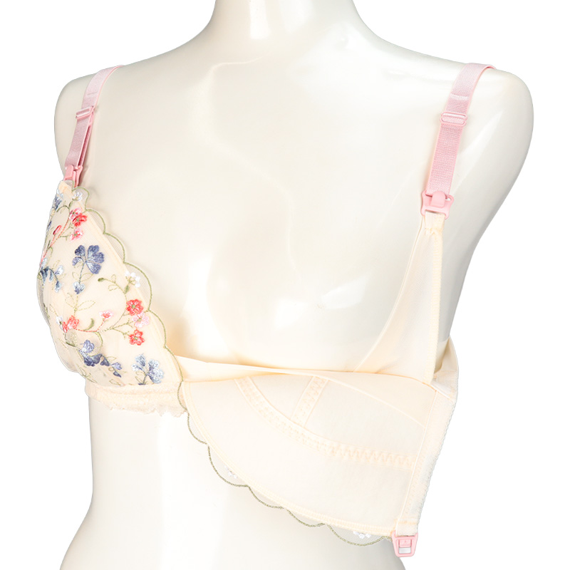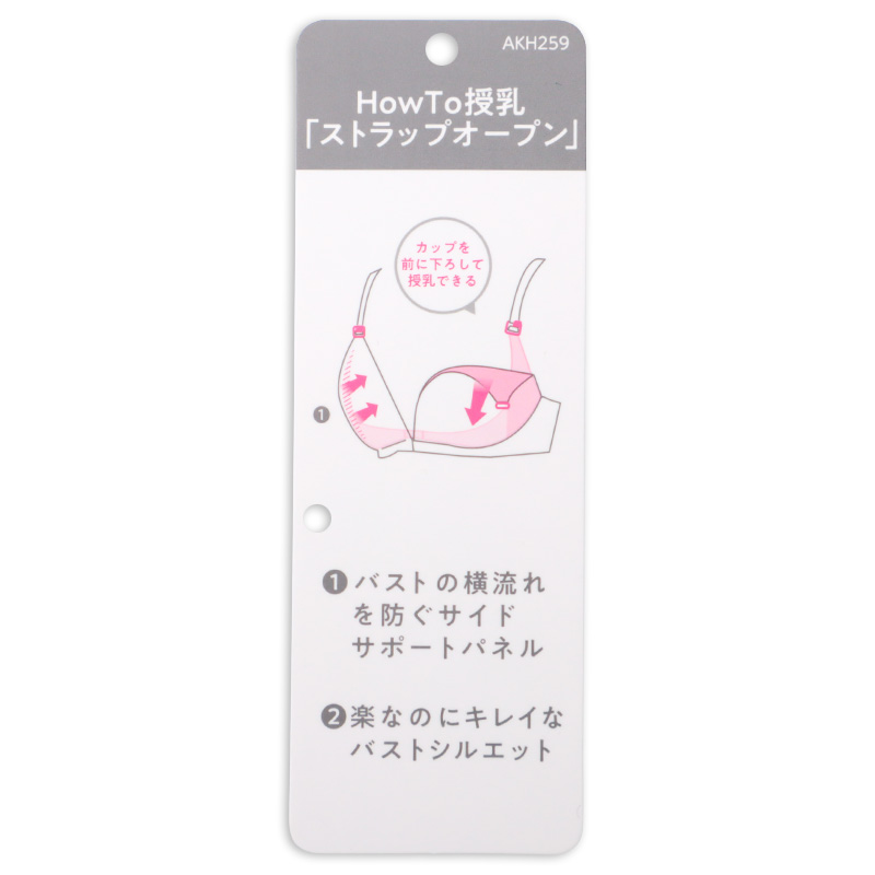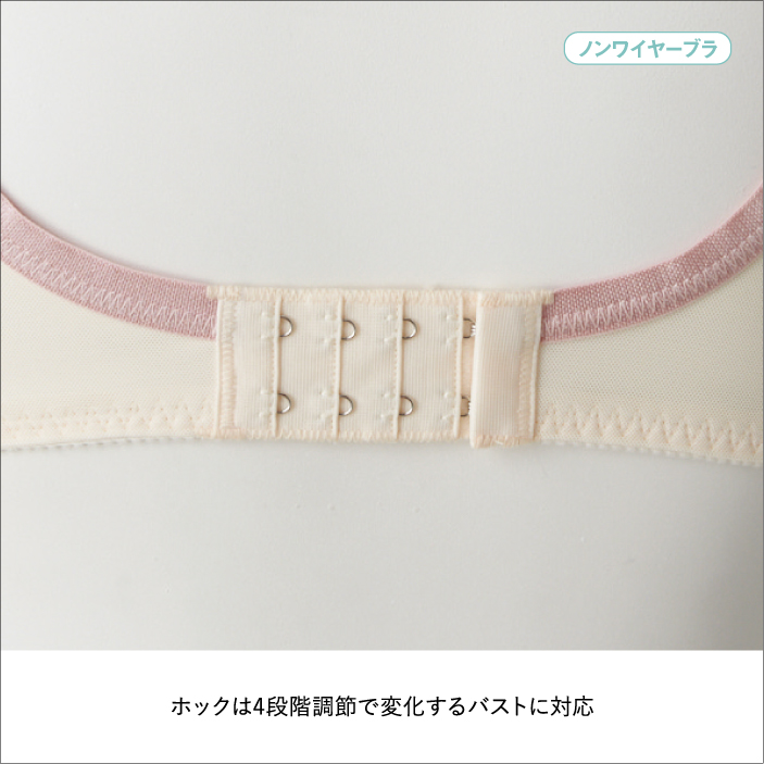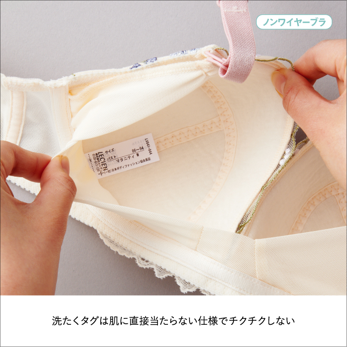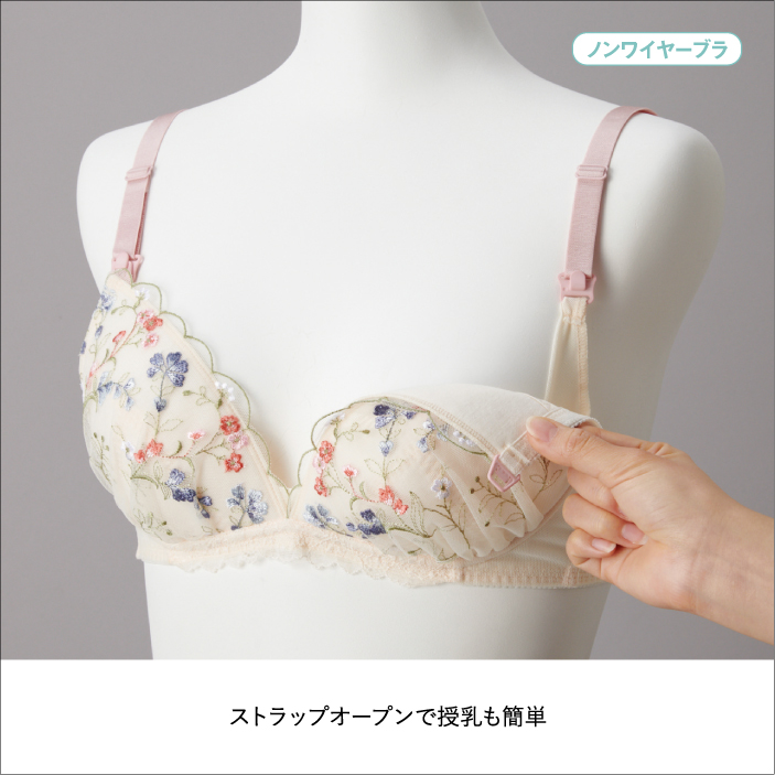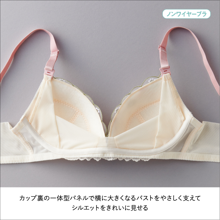 ストラップオープンで授乳がラク。 ラクもキレイもかなえたいノンワイヤーブラに新しいデザインが仲間入りしました。 カップ裏サイドとアンダー部分にパワーネットを施した設計でバストの横流れを防ぎ、 キレイなバストシルエットをつくります。 4列ホックにより体型変化に合わせてアンダー調節ができます。 洗濯ネームは肌当たりに配慮して、カップ裏隠し付け仕様にしています。