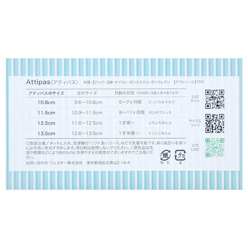 年齢別サイズの目安M:11.5cm 足のサイズ:109~115mm 目安年齢:8~11ヶ月 L:12.5cm 足のサイズ:116~125mm 目安年齢:12ヶ月~ XL:13.5cm 足のサイズ:126~135mm 目安年齢:18ヶ月~ アッパー:綿・ナイロン・ポリエステル・ポリウレタン アウトソール:サーモプラスチックラバー