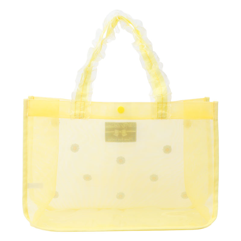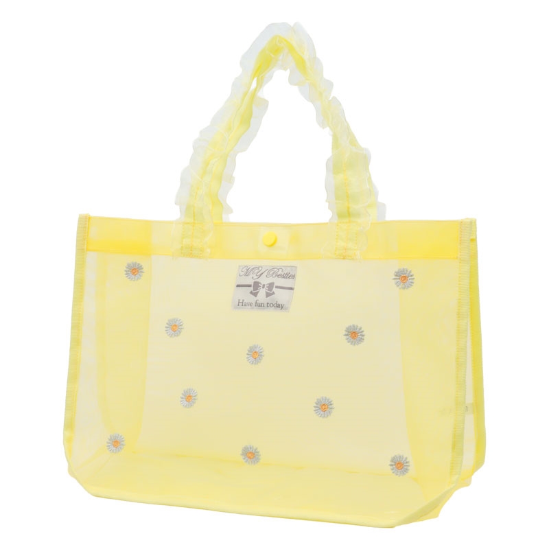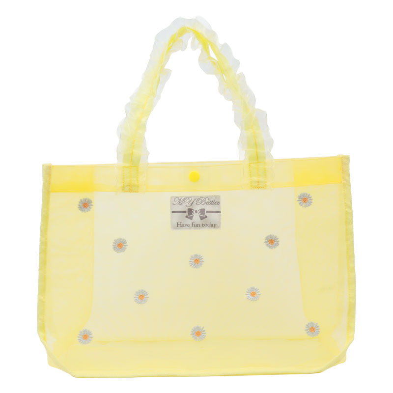 夏のマストアイテム!持ち手部分にはオーガンジー素材のフリルテープ付き。 可愛いマーガレットの刺繍入りバックです!