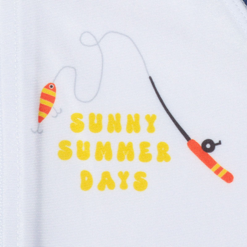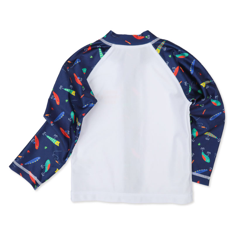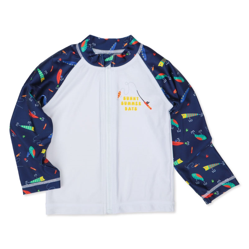 赤ちゃん本舗オリジナルデザインの長袖ラッシュガードです。おしゃれなルアー柄デザイン。サーフパンツの着合わせも可能です。UVカット加工素材で、紫外線防止にぴったりの長袖タイプです。海、川、山のアウトドアやおうちプールにも使えます。